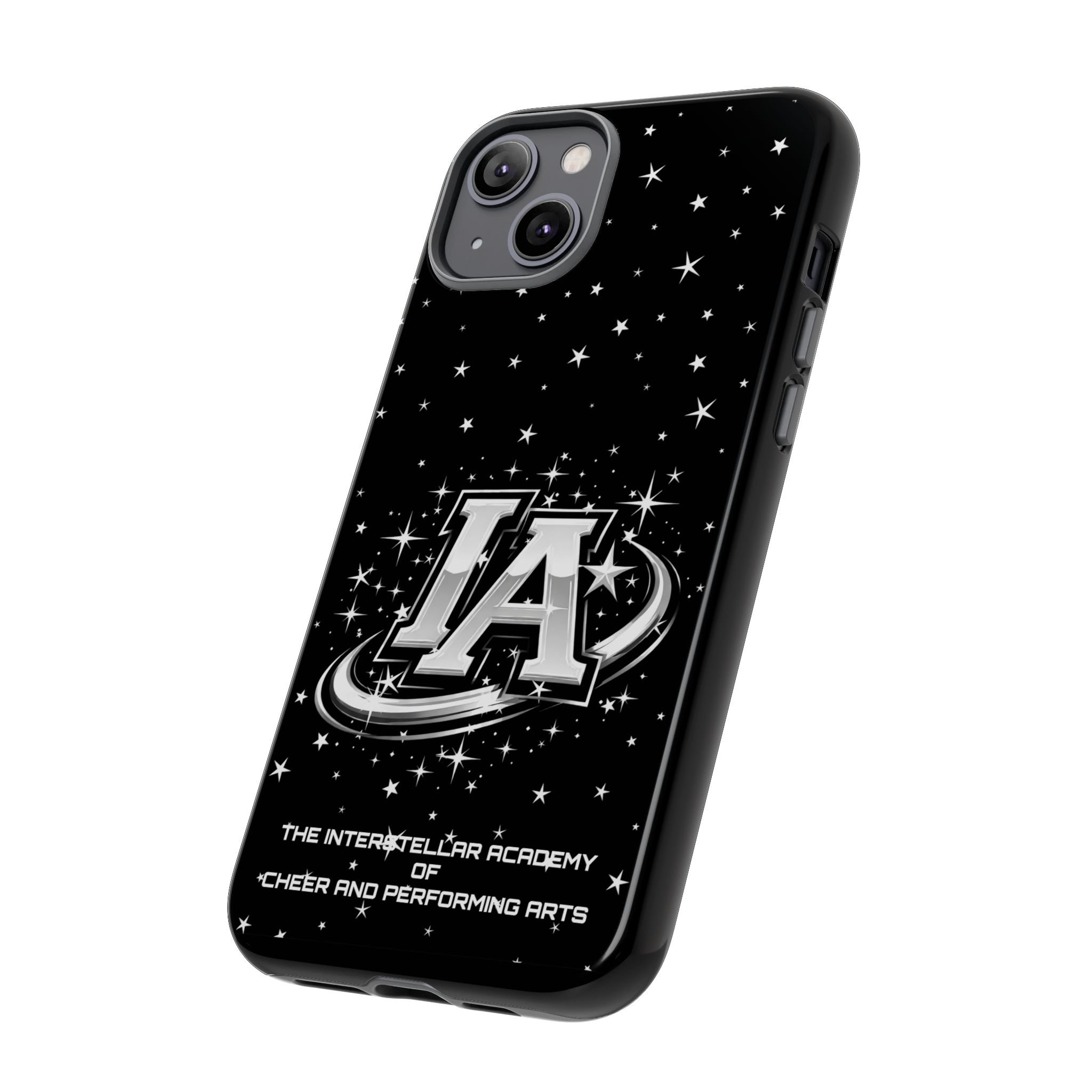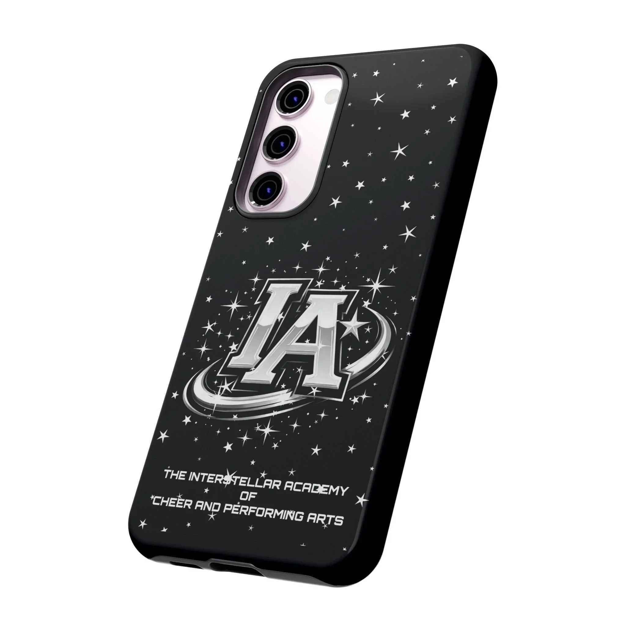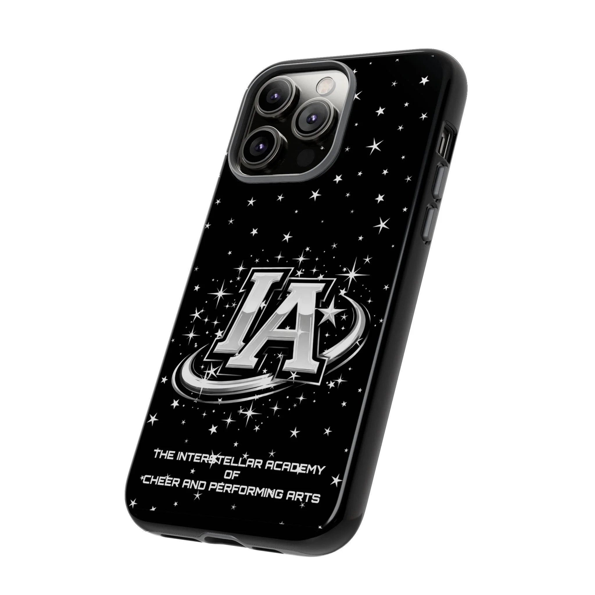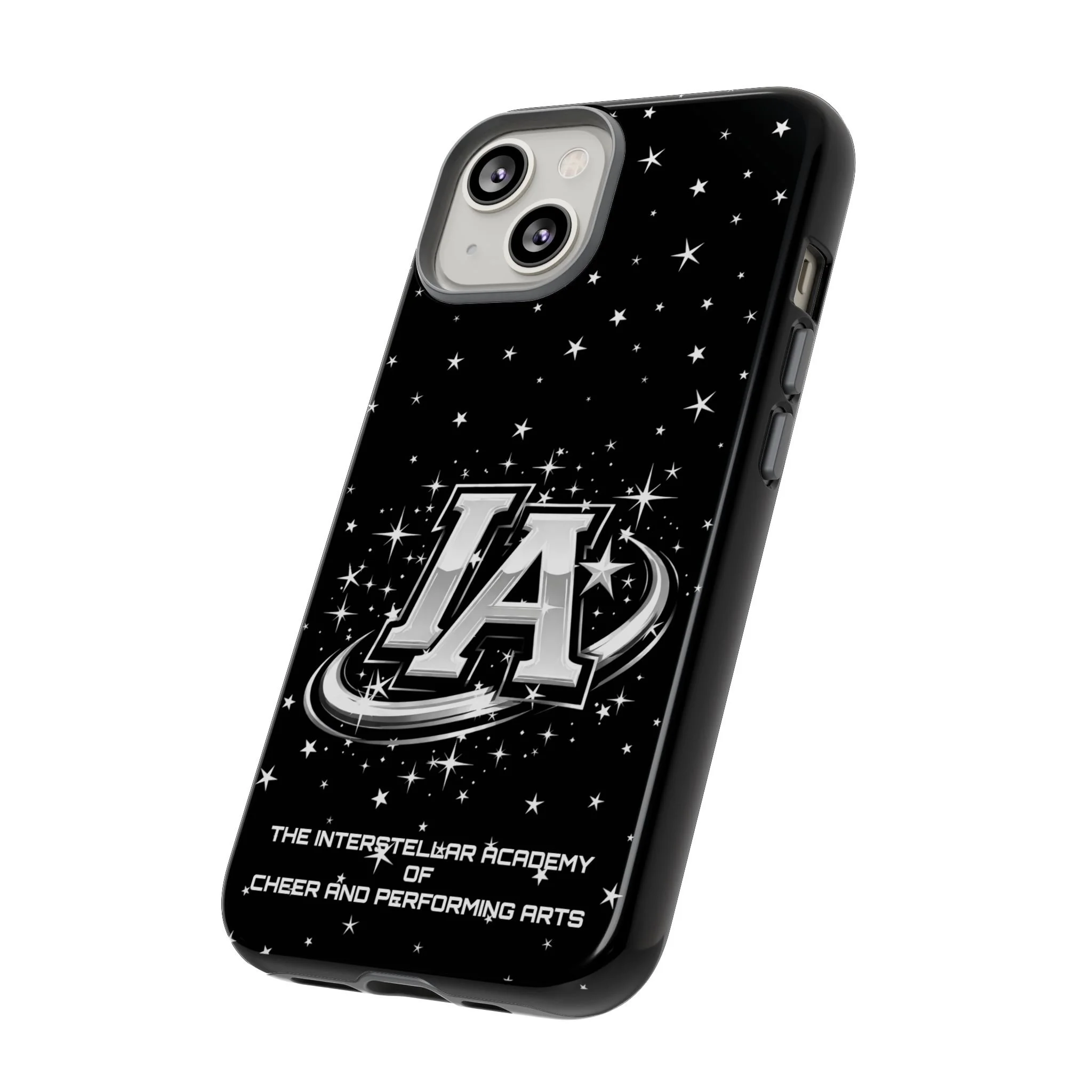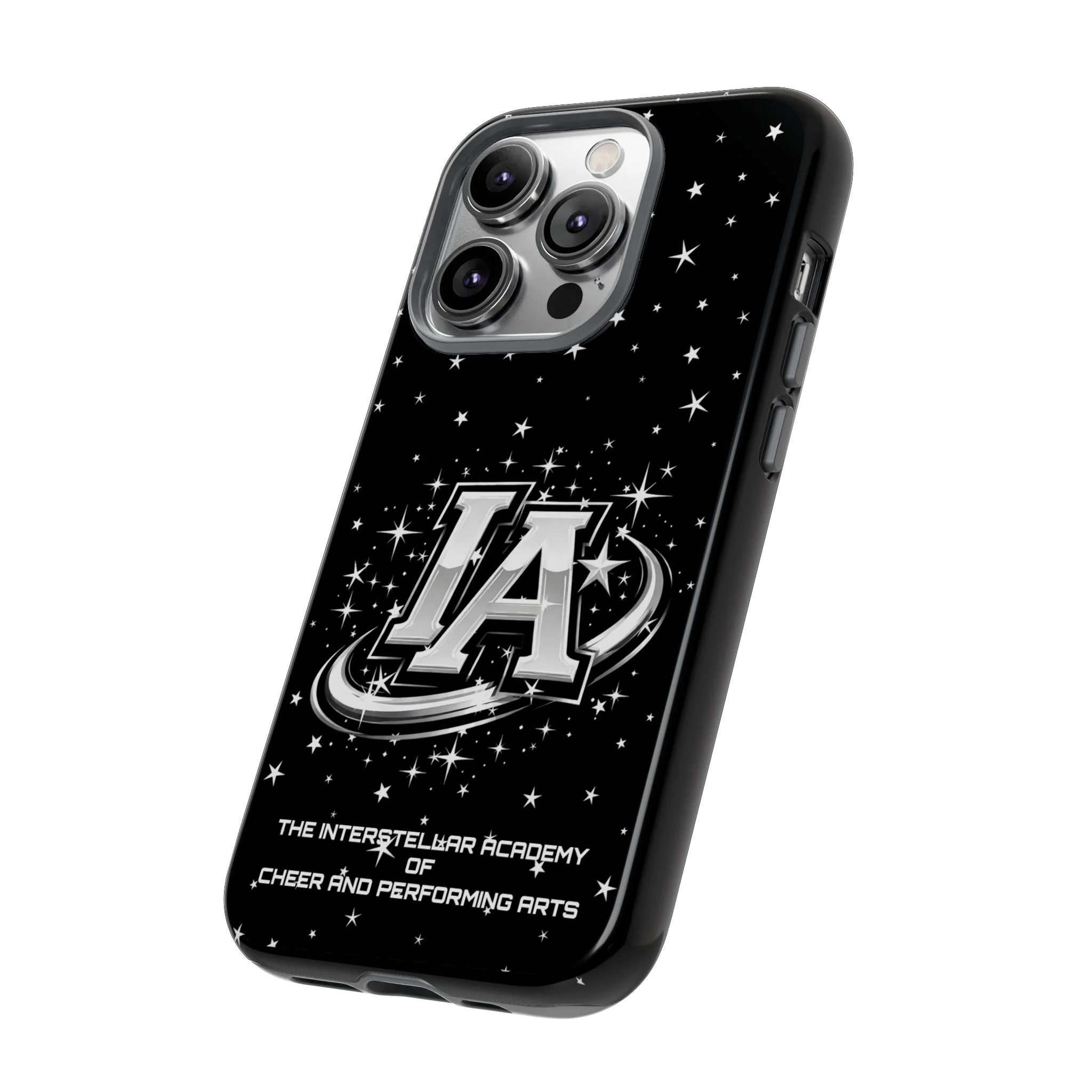 This protective phone case brings a bold, cosmic vibe to everyday carry. A glossy black background scatters tiny stars displaying the Interstellar Academy IA logo. The case feels sturdy in hand: a rigid polycarbonate shell with a soft TPU silicone liner absorbs shocks and cushions drops. UV protection keeps the print looking sharp outdoors; clear cutouts preserve easy access to ports and wireless charging. It’s the kind of case that reads like team gear for performers who want stage-ready sparkle in their pocket.