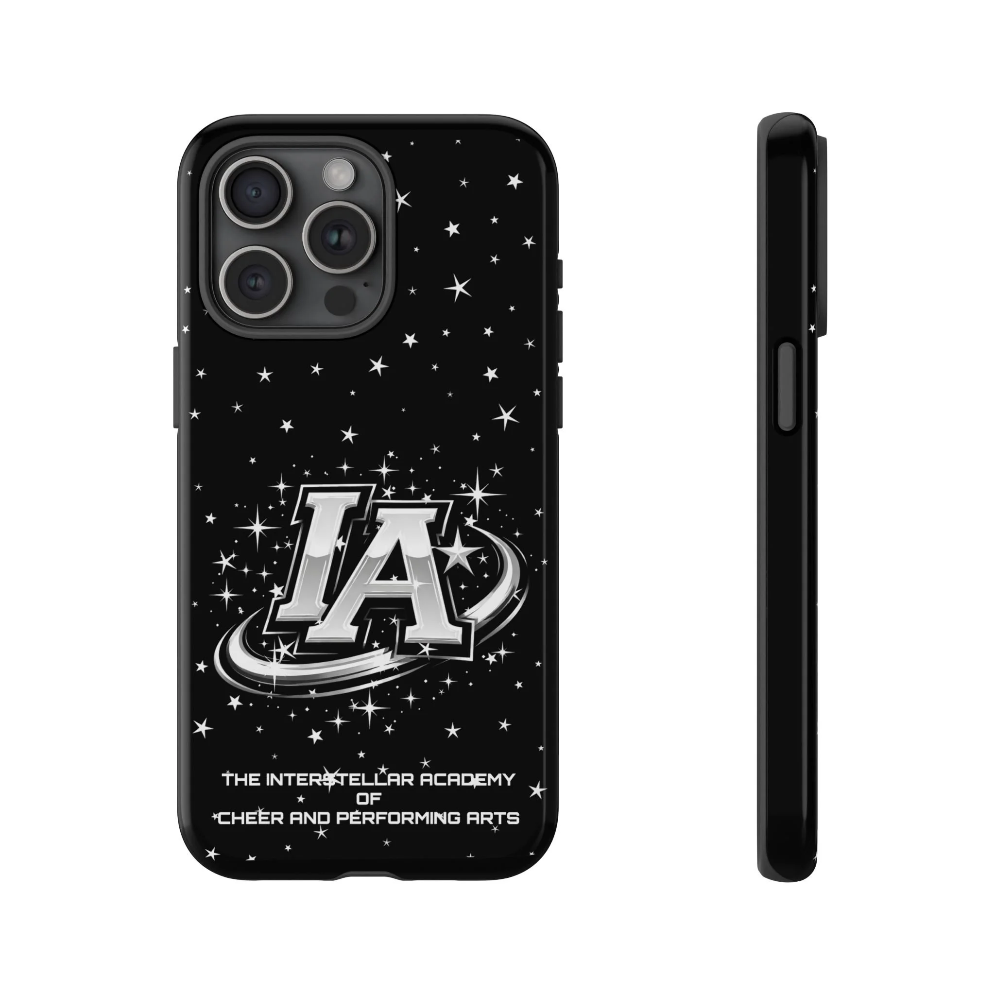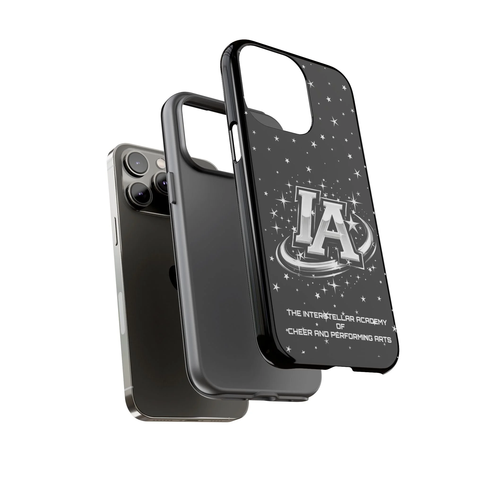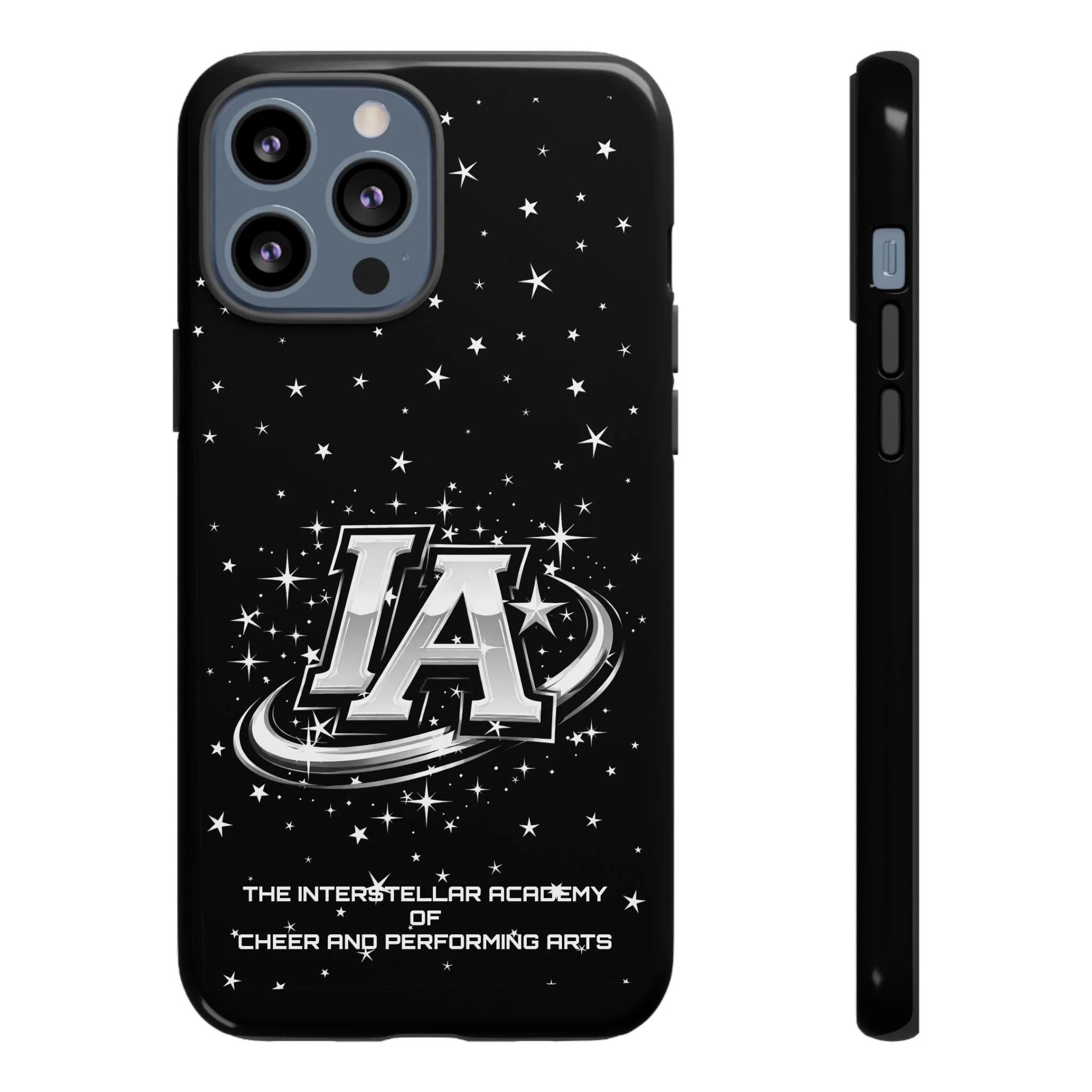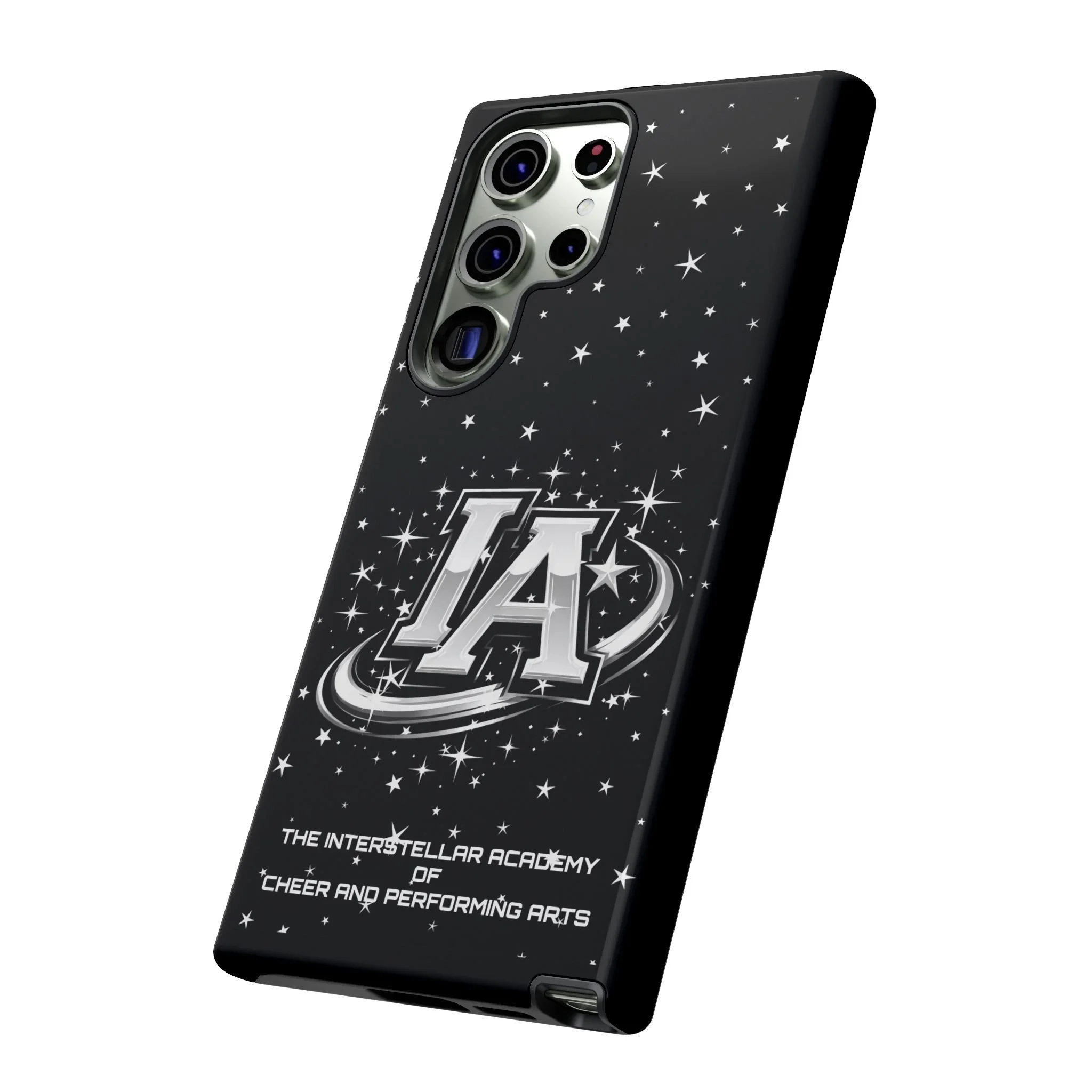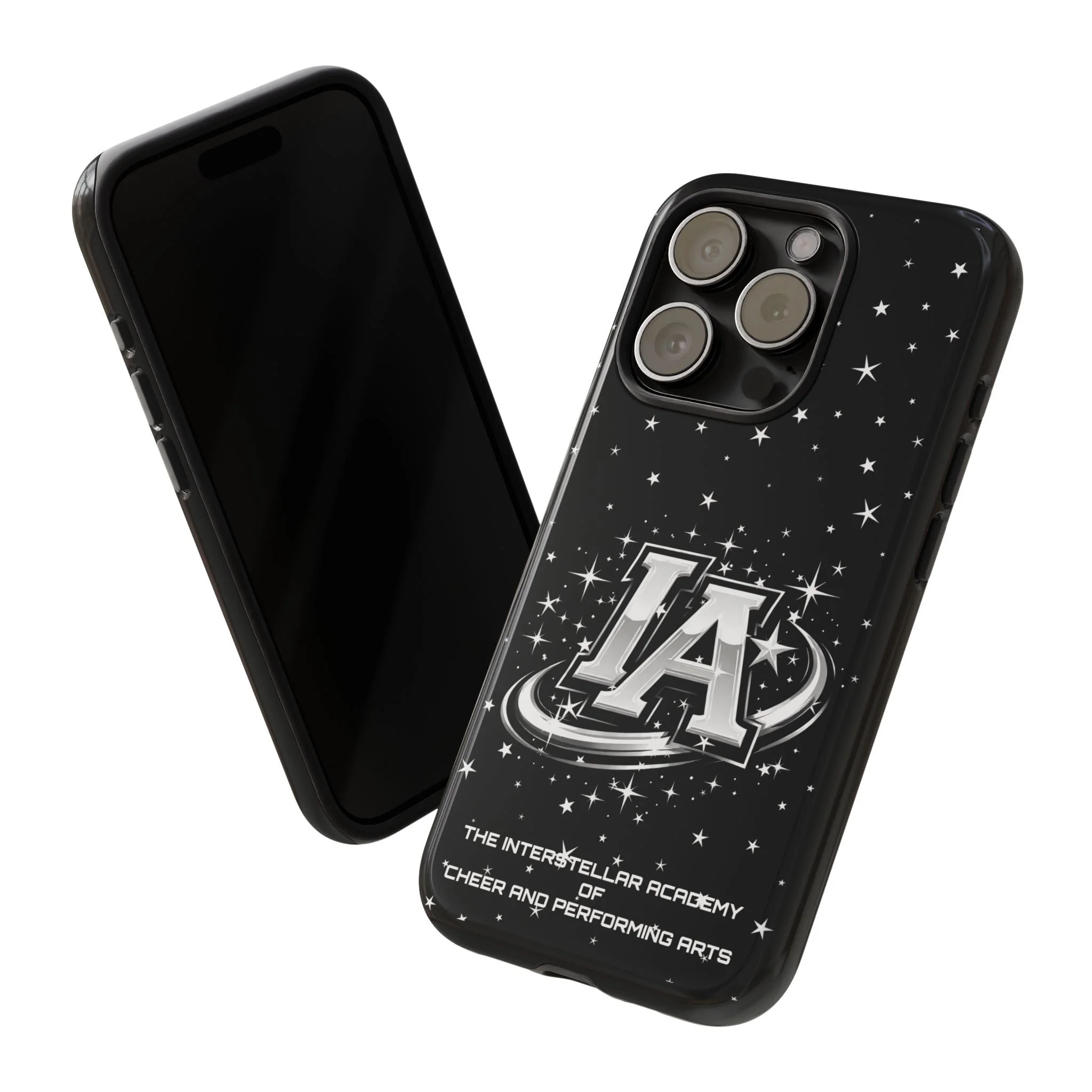 This protective phone case brings a bold, cosmic vibe to everyday carry. A glossy black background scatters tiny stars displaying the Interstellar Academy IA logo. The case feels sturdy in hand: a rigid polycarbonate shell with a soft TPU silicone liner absorbs shocks and cushions drops. UV protection keeps the print looking sharp outdoors; clear cutouts preserve easy access to ports and wireless charging. It’s the kind of case that reads like team gear for performers who want stage-ready sparkle in their pocket.