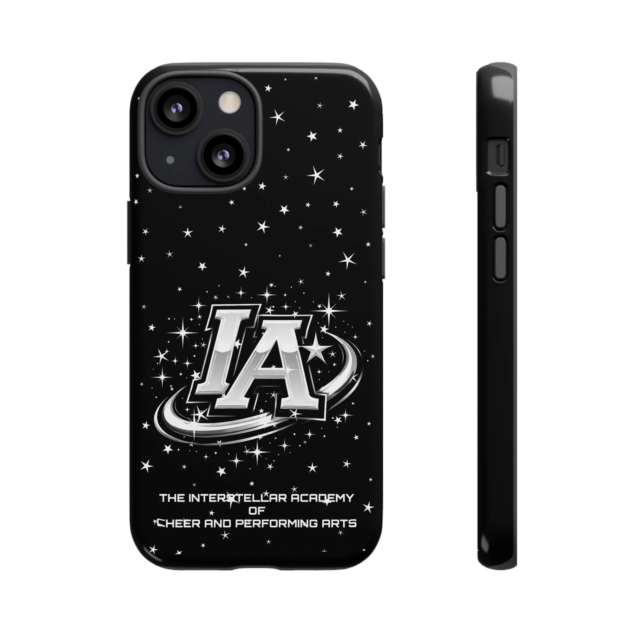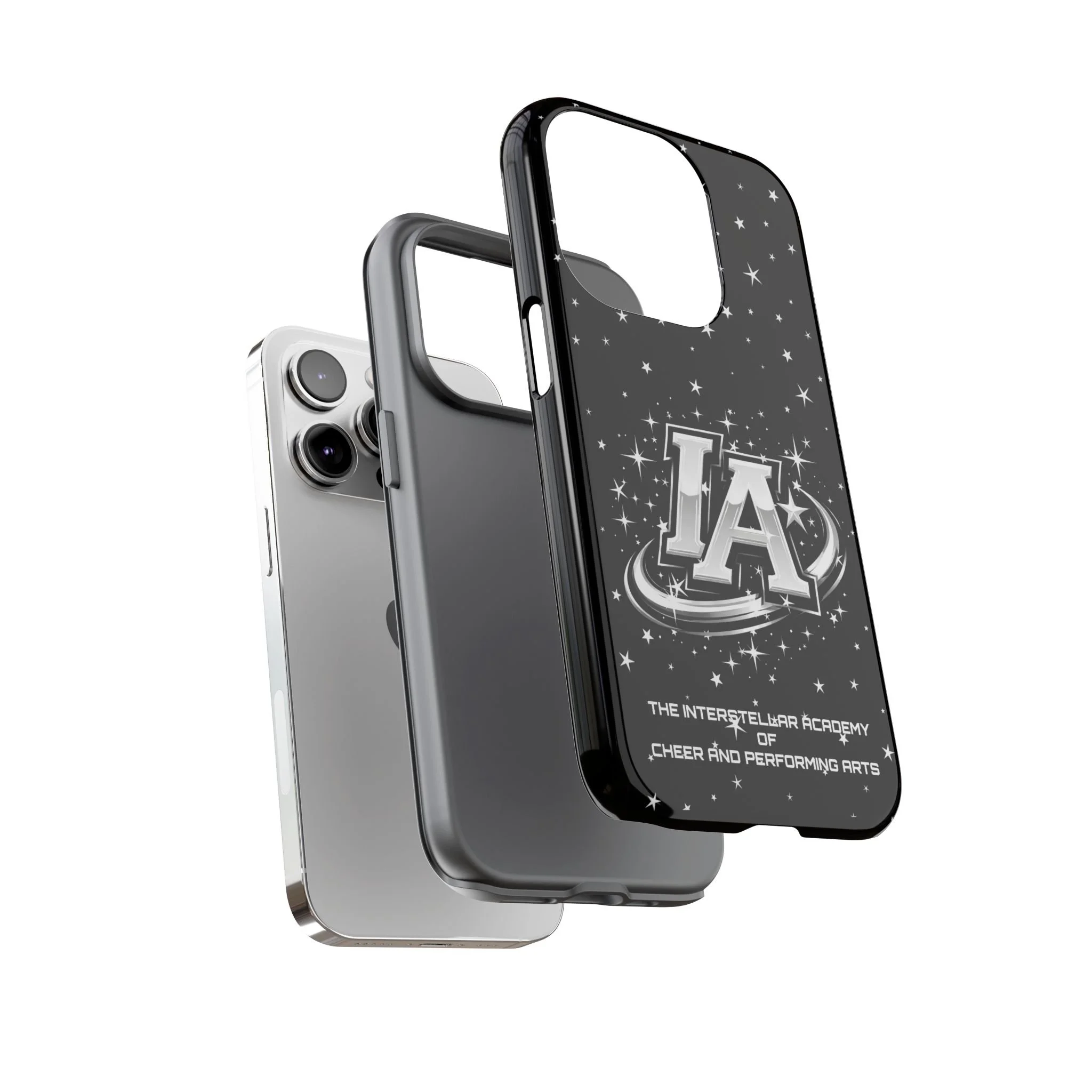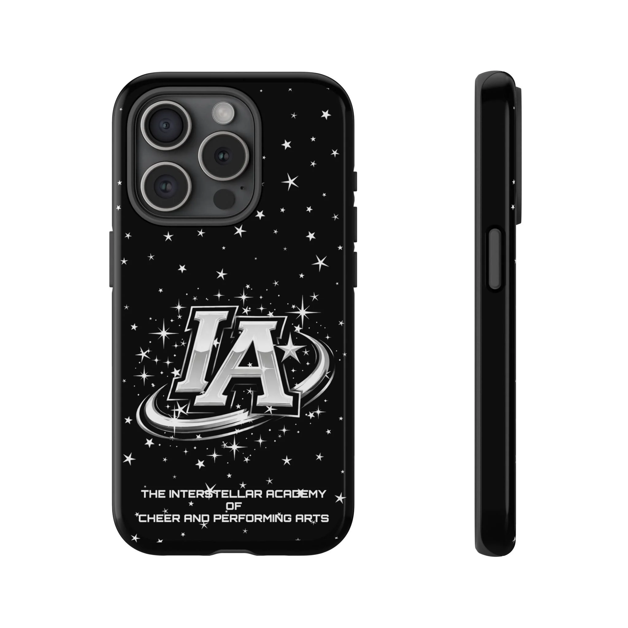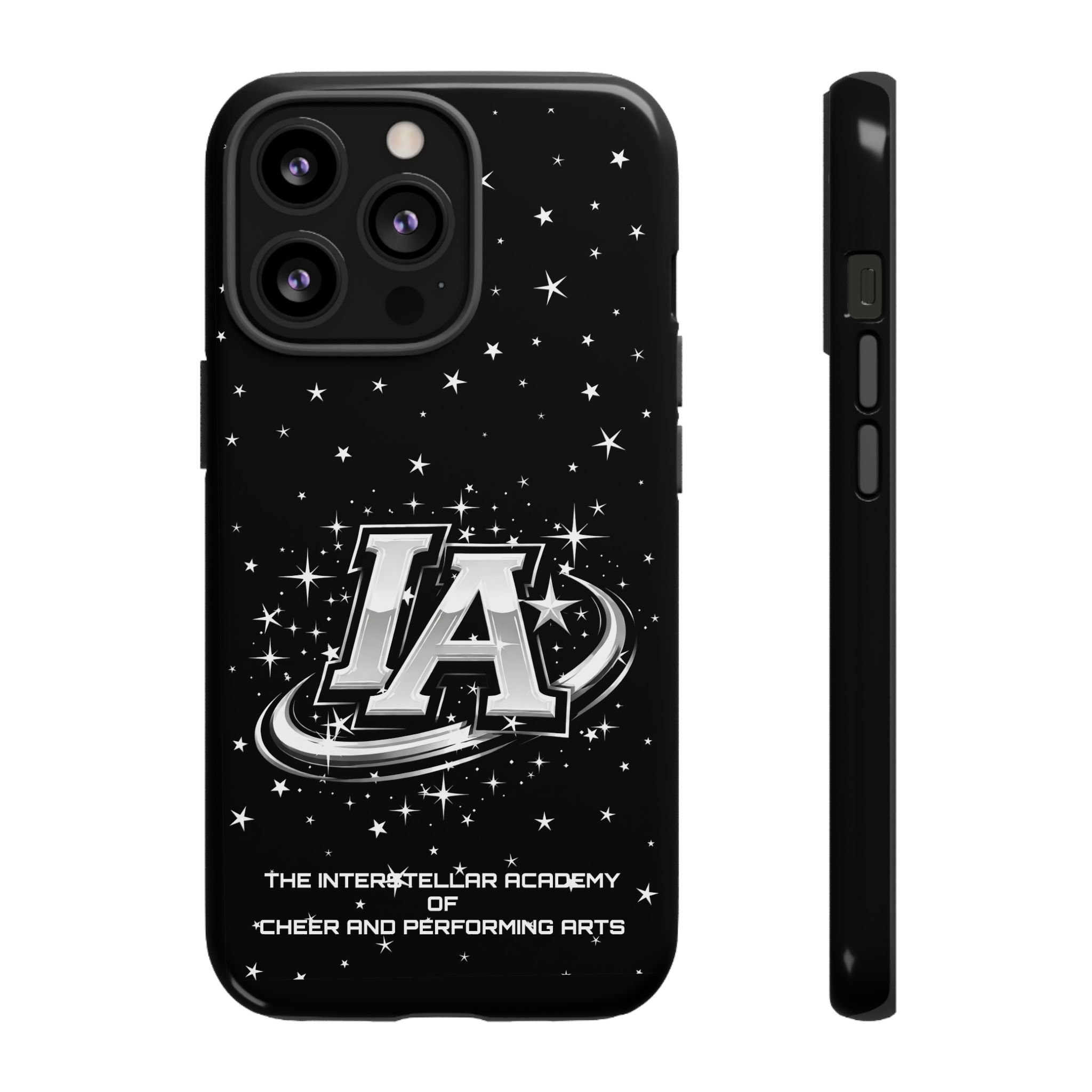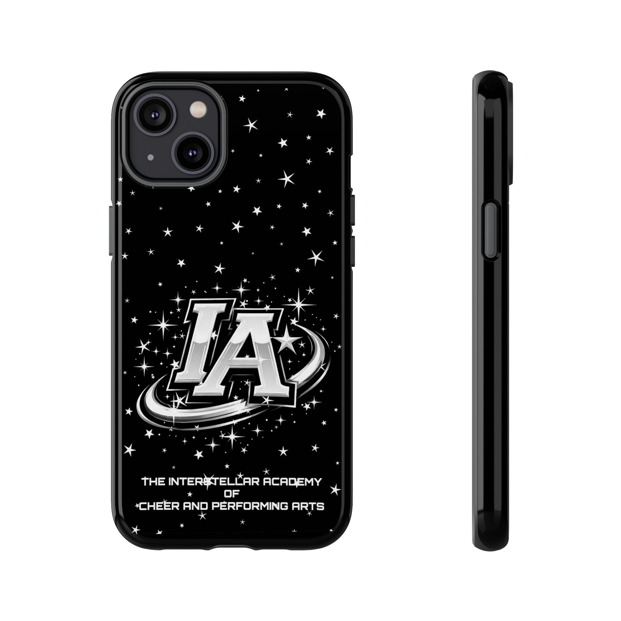 This protective phone case brings a bold, cosmic vibe to everyday carry. A glossy black background scatters tiny stars displaying the Interstellar Academy IA logo. The case feels sturdy in hand: a rigid polycarbonate shell with a soft TPU silicone liner absorbs shocks and cushions drops. UV protection keeps the print looking sharp outdoors; clear cutouts preserve easy access to ports and wireless charging. It’s the kind of case that reads like team gear for performers who want stage-ready sparkle in their pocket.