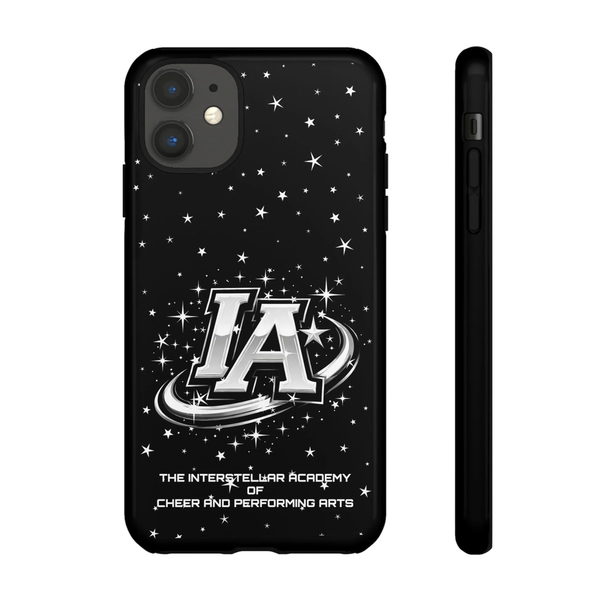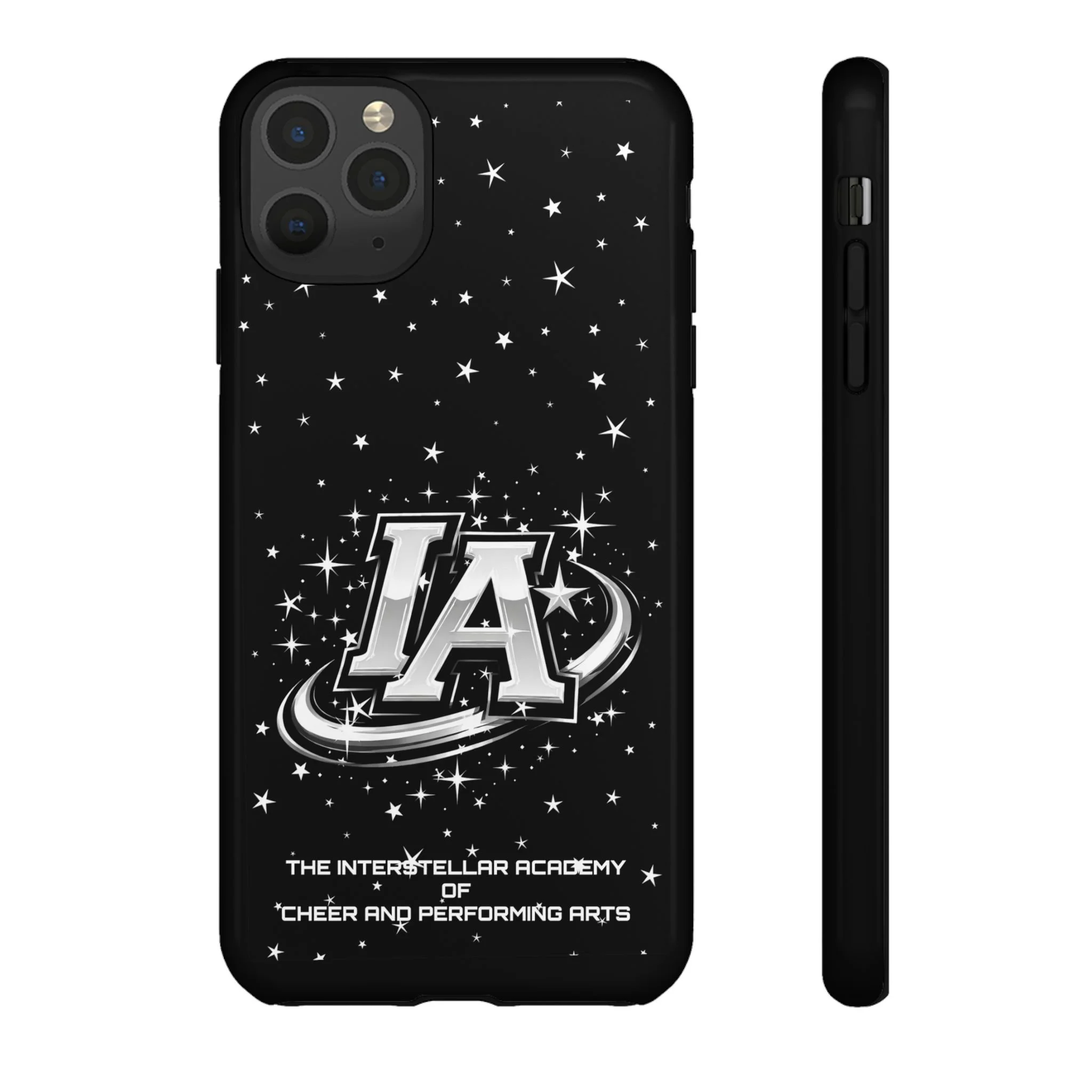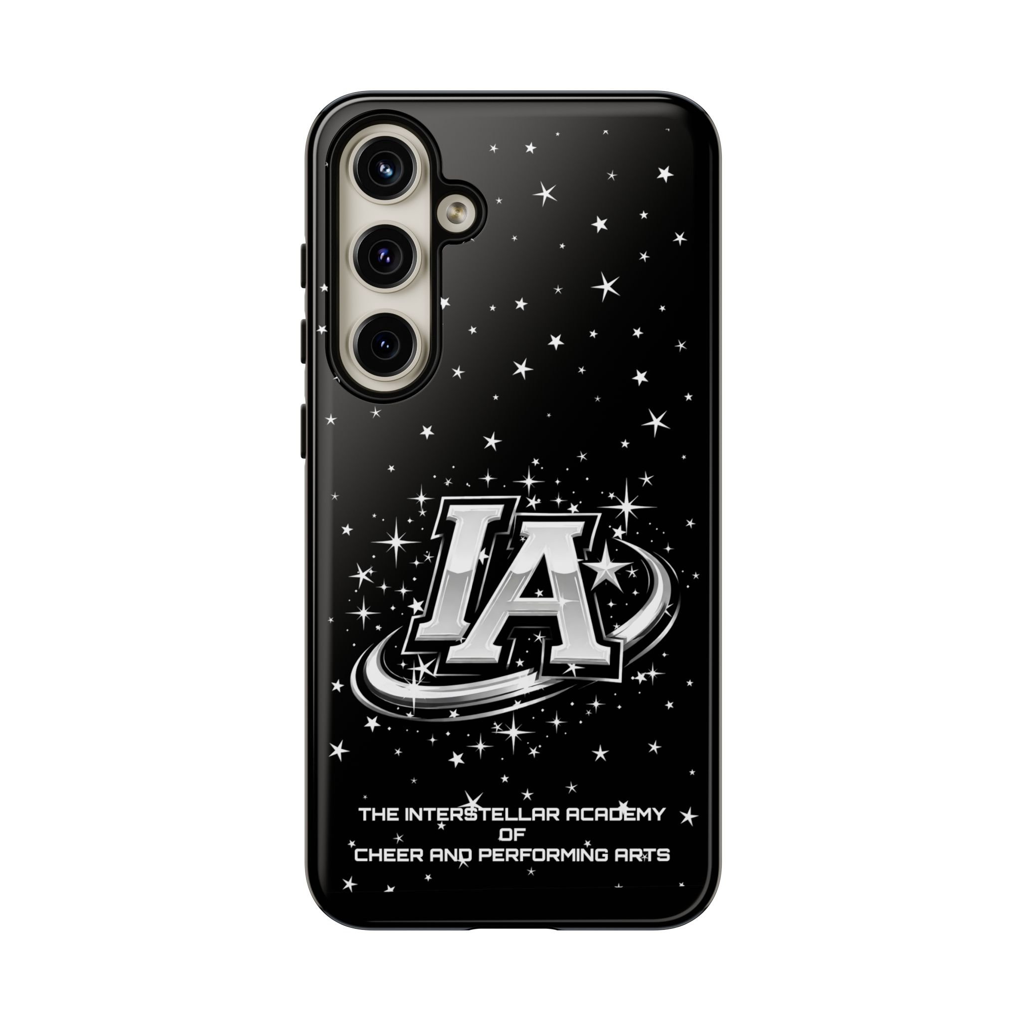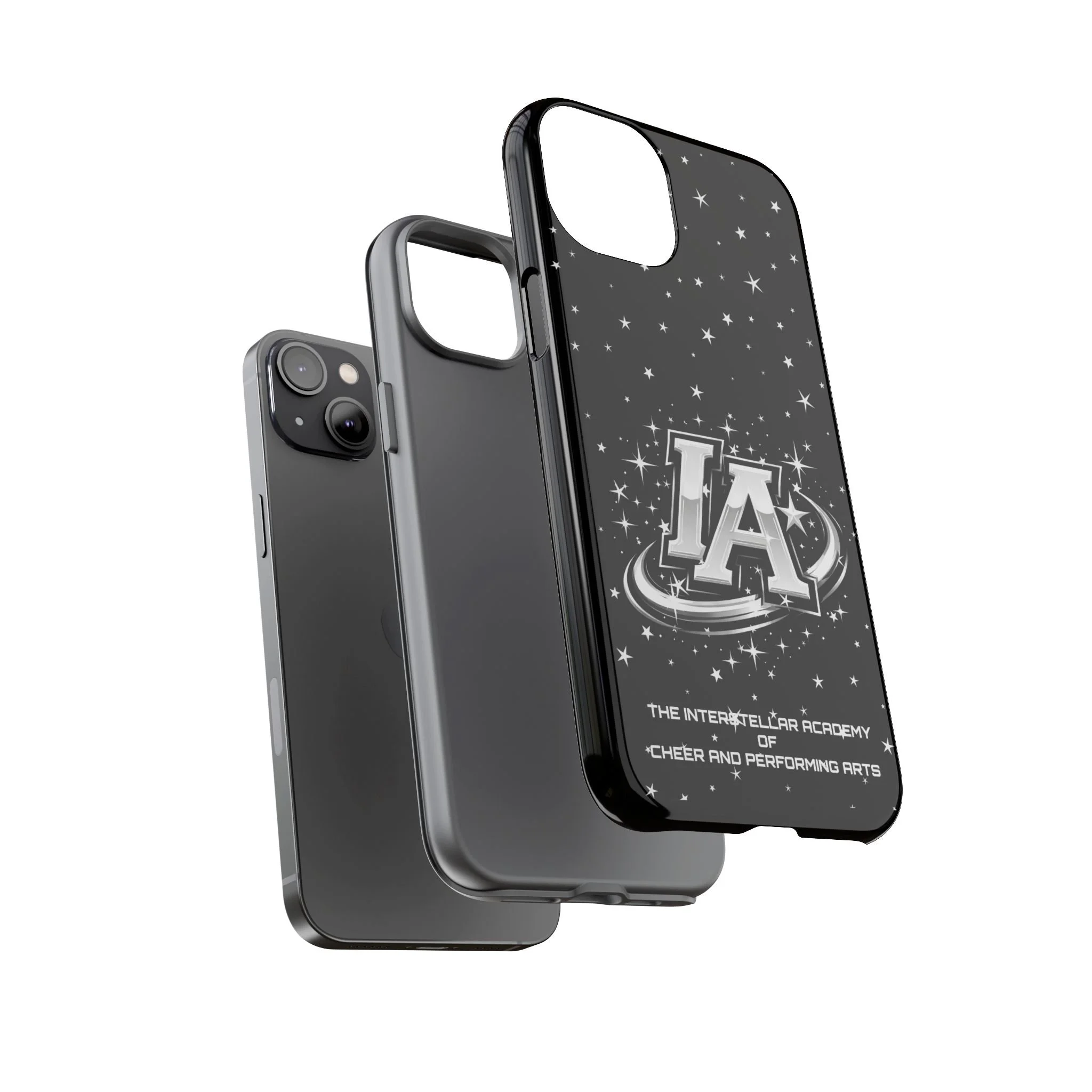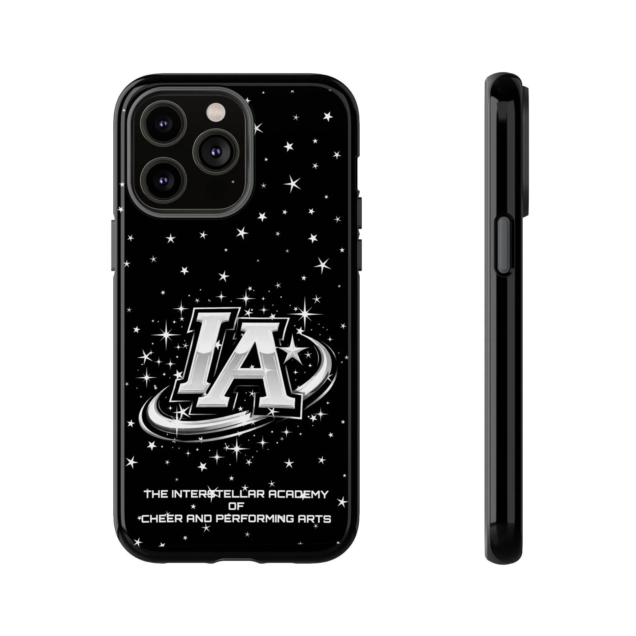 This protective phone case brings a bold, cosmic vibe to everyday carry. A glossy black background scatters tiny stars displaying the Interstellar Academy IA logo. The case feels sturdy in hand: a rigid polycarbonate shell with a soft TPU silicone liner absorbs shocks and cushions drops. UV protection keeps the print looking sharp outdoors; clear cutouts preserve easy access to ports and wireless charging. It’s the kind of case that reads like team gear for performers who want stage-ready sparkle in their pocket.