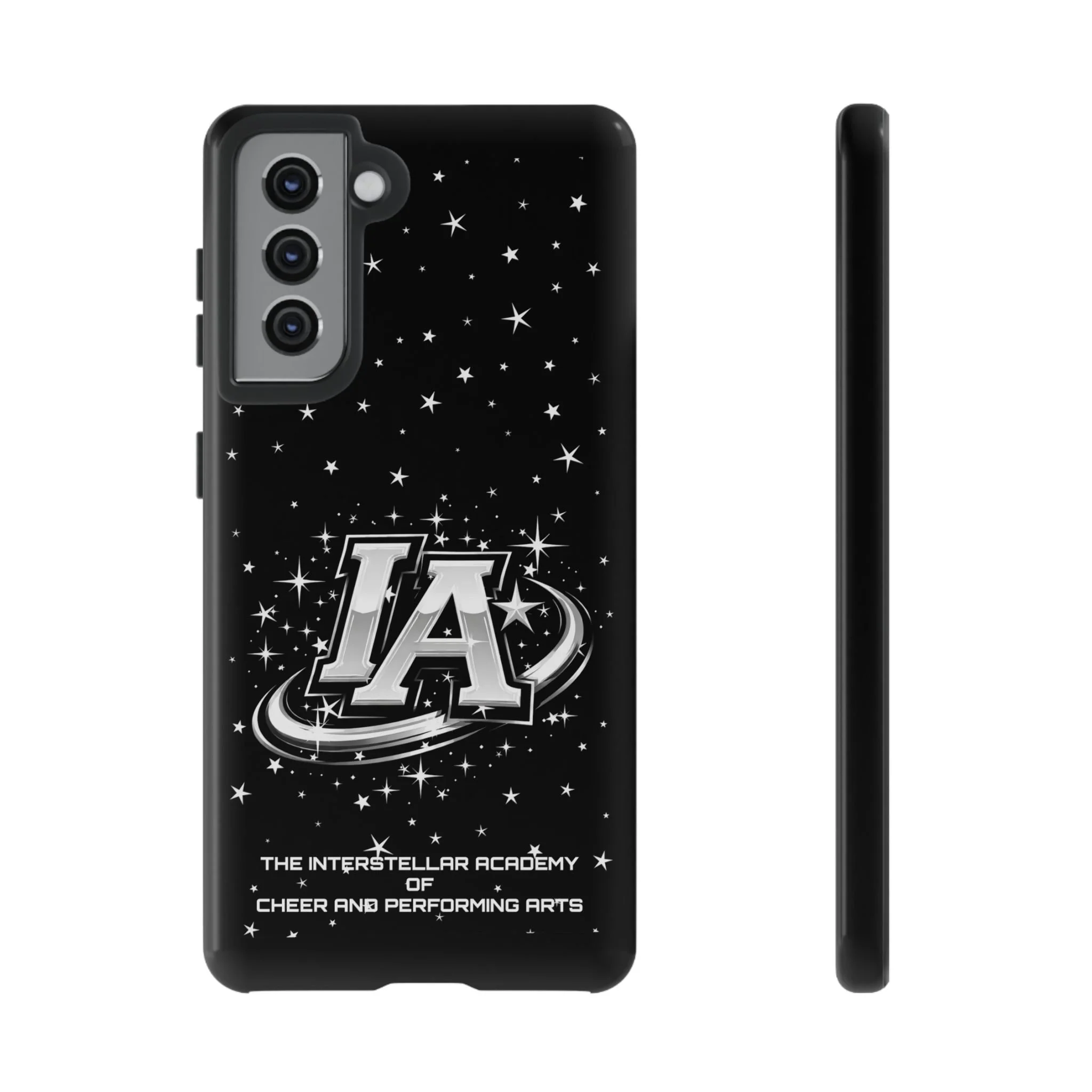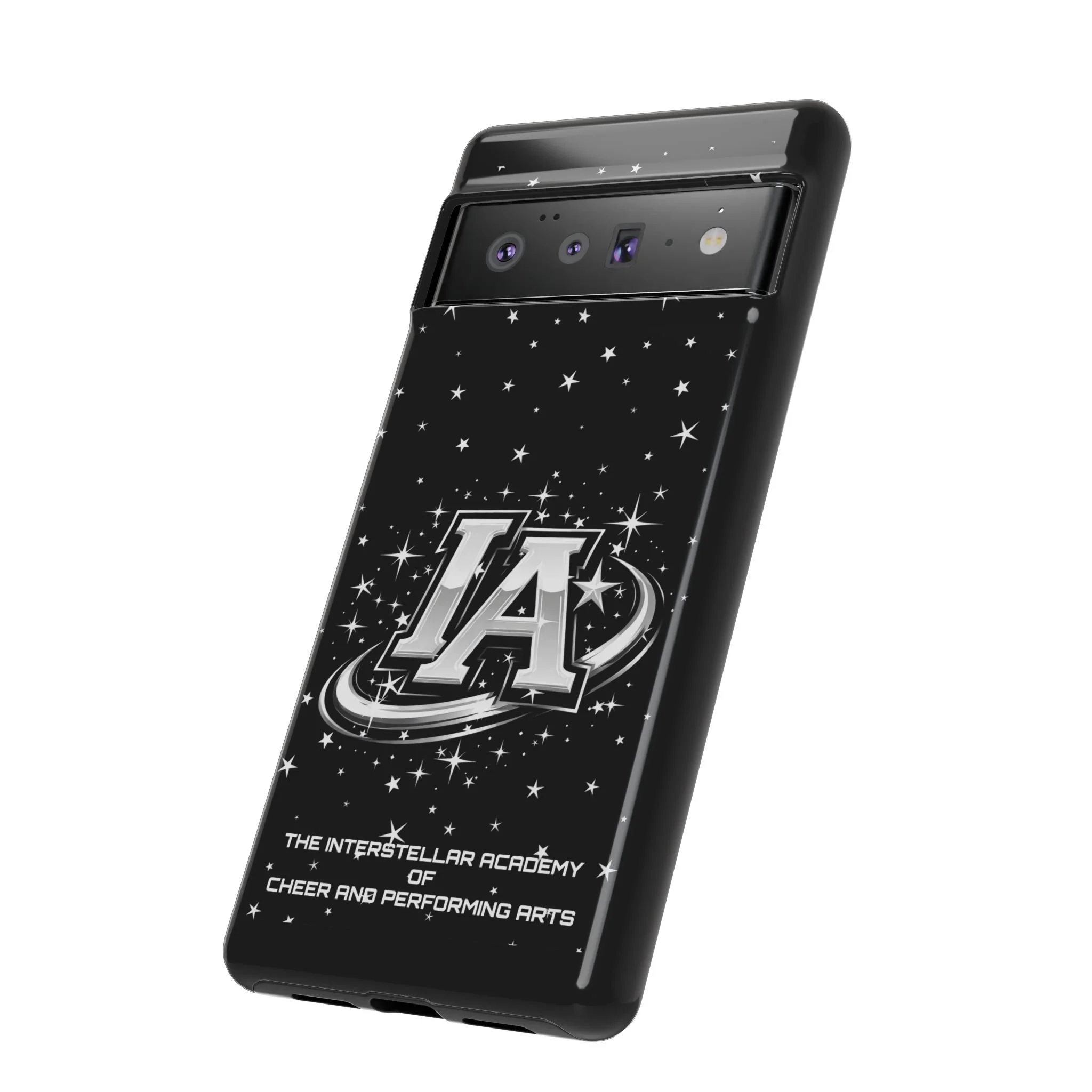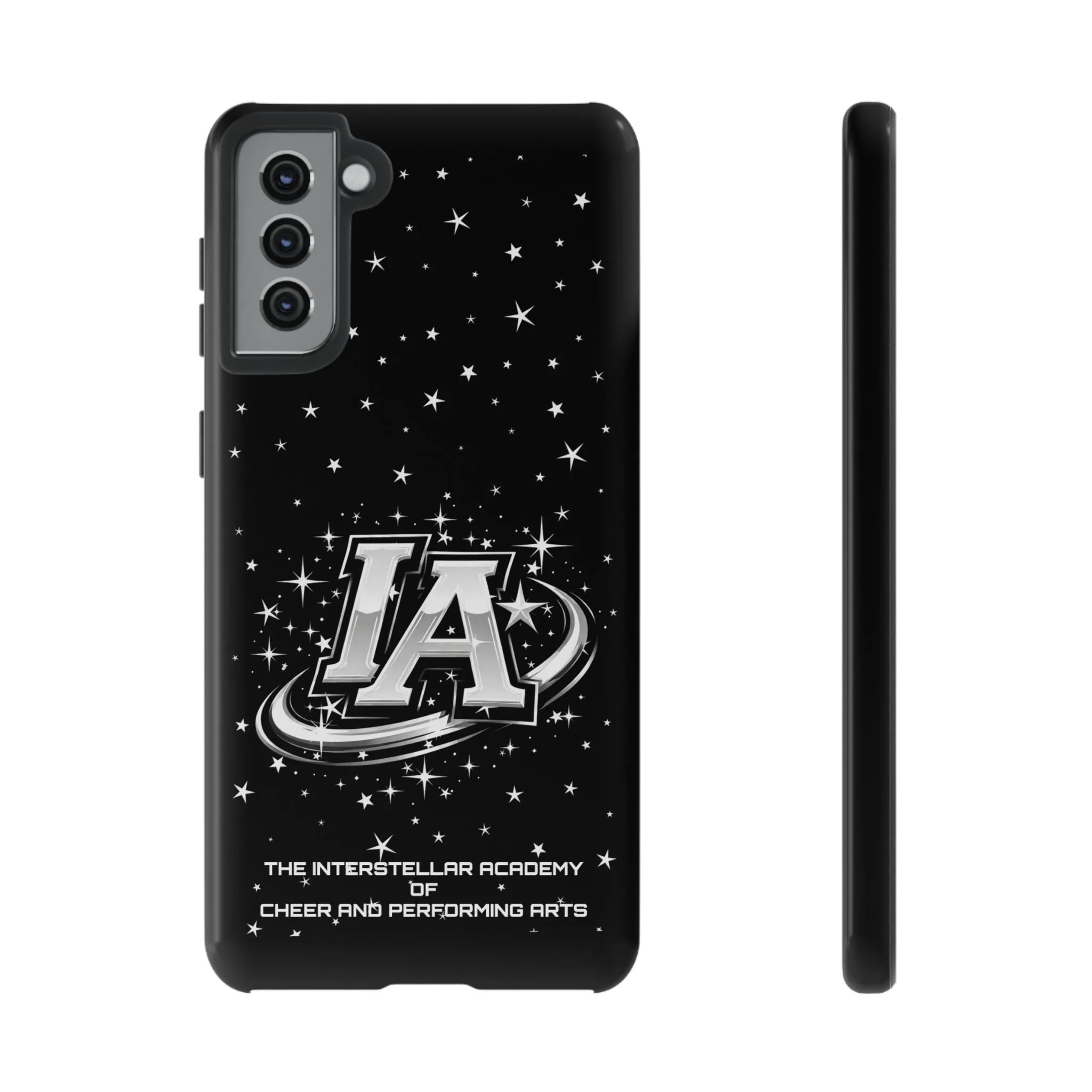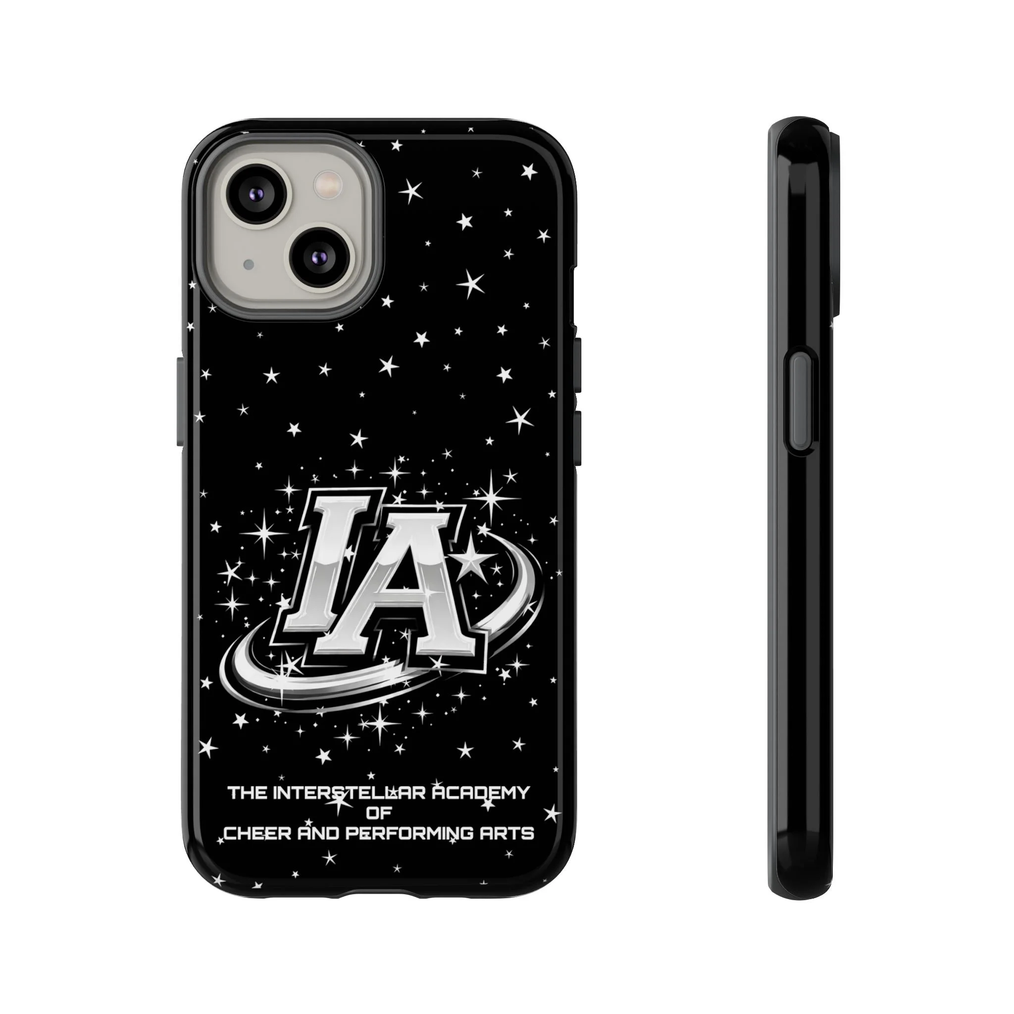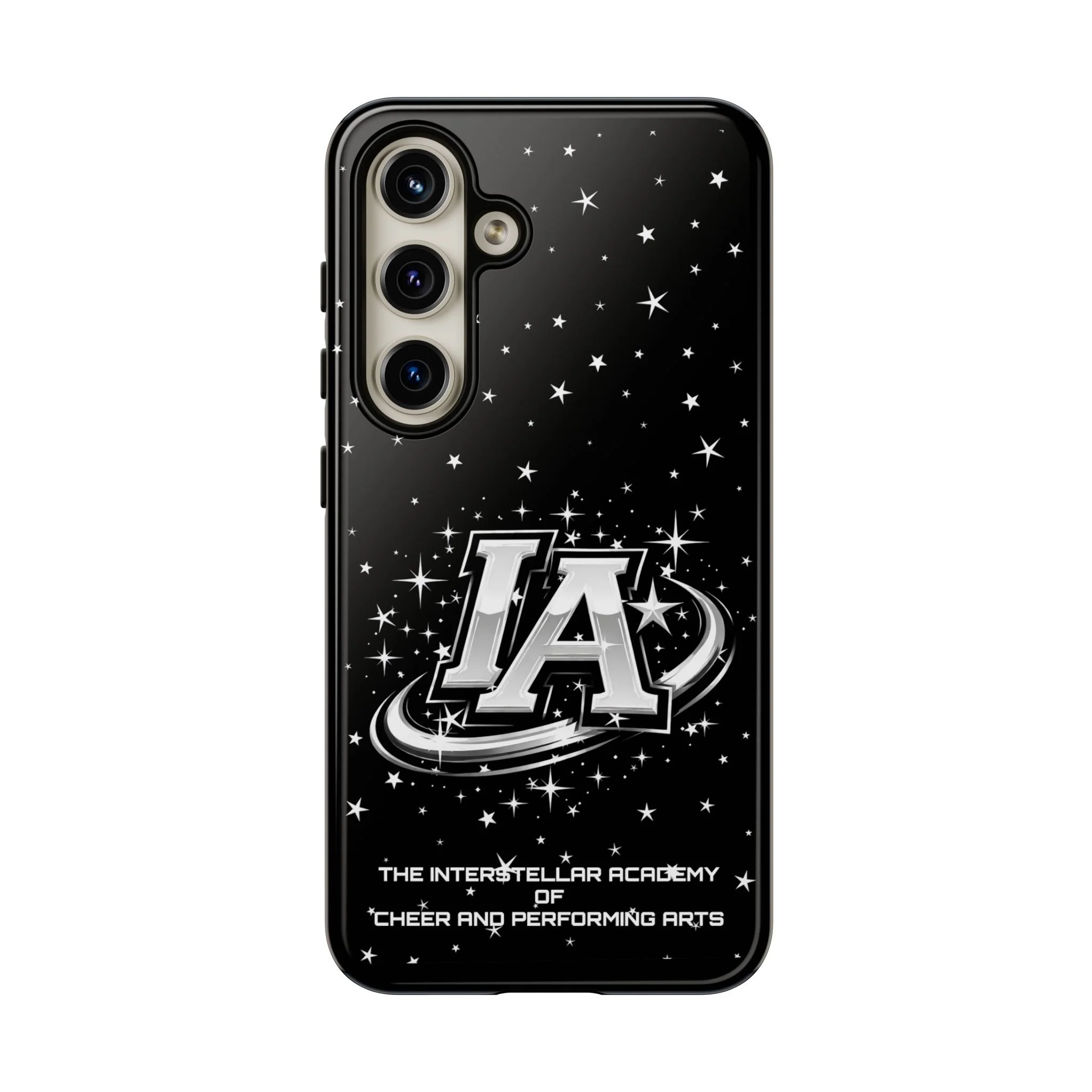 This protective phone case brings a bold, cosmic vibe to everyday carry. A glossy black background scatters tiny stars displaying the Interstellar Academy IA logo. The case feels sturdy in hand: a rigid polycarbonate shell with a soft TPU silicone liner absorbs shocks and cushions drops. UV protection keeps the print looking sharp outdoors; clear cutouts preserve easy access to ports and wireless charging. It’s the kind of case that reads like team gear for performers who want stage-ready sparkle in their pocket.