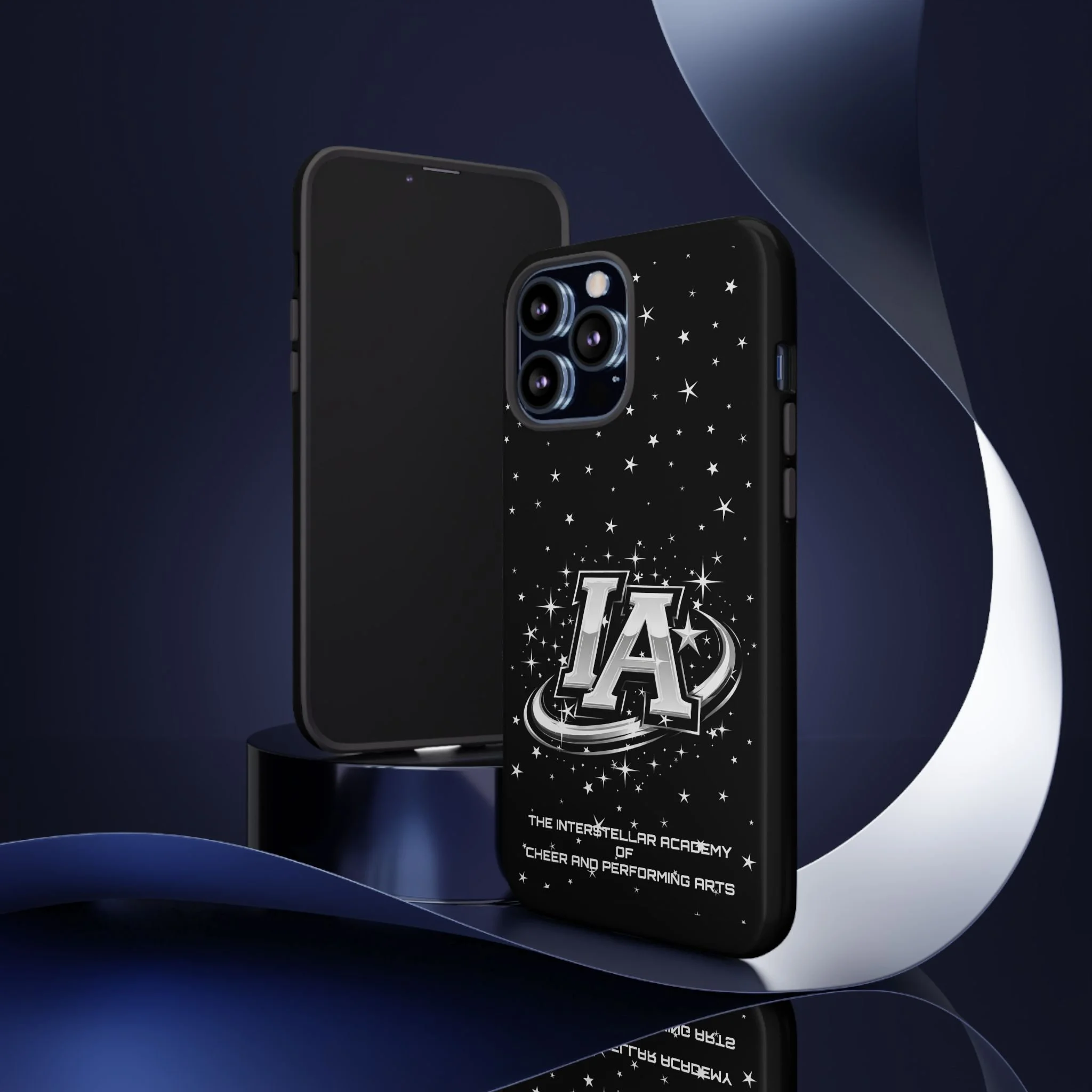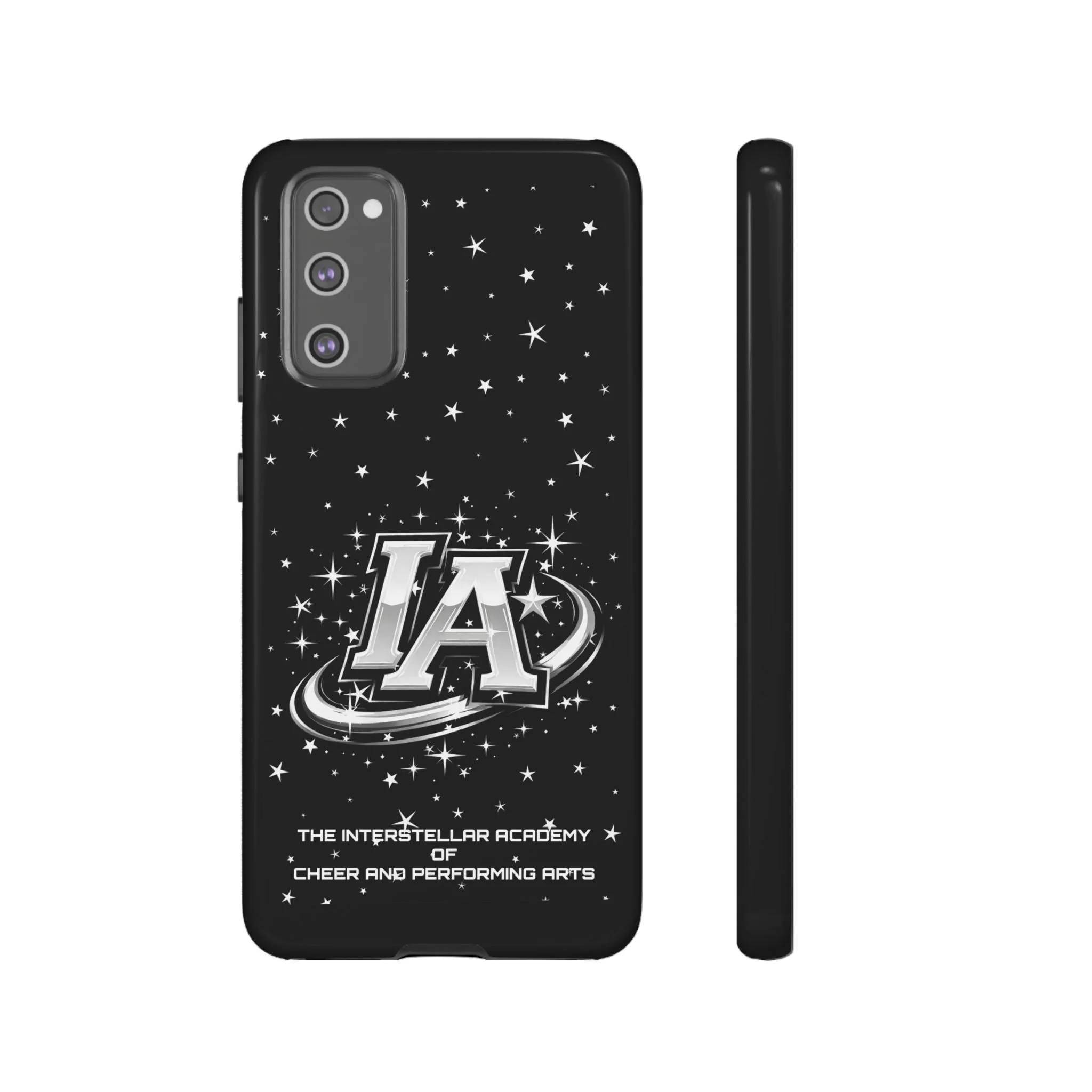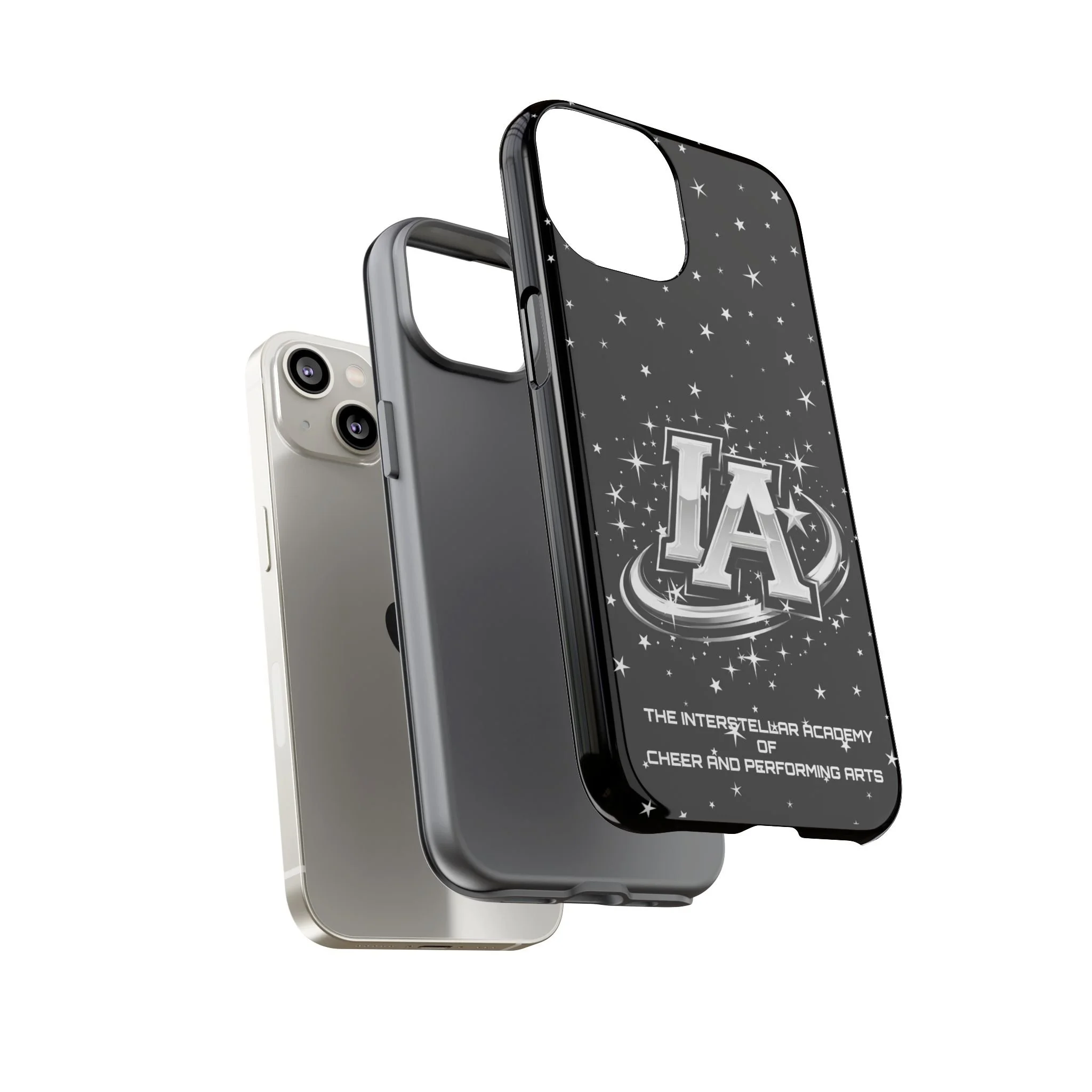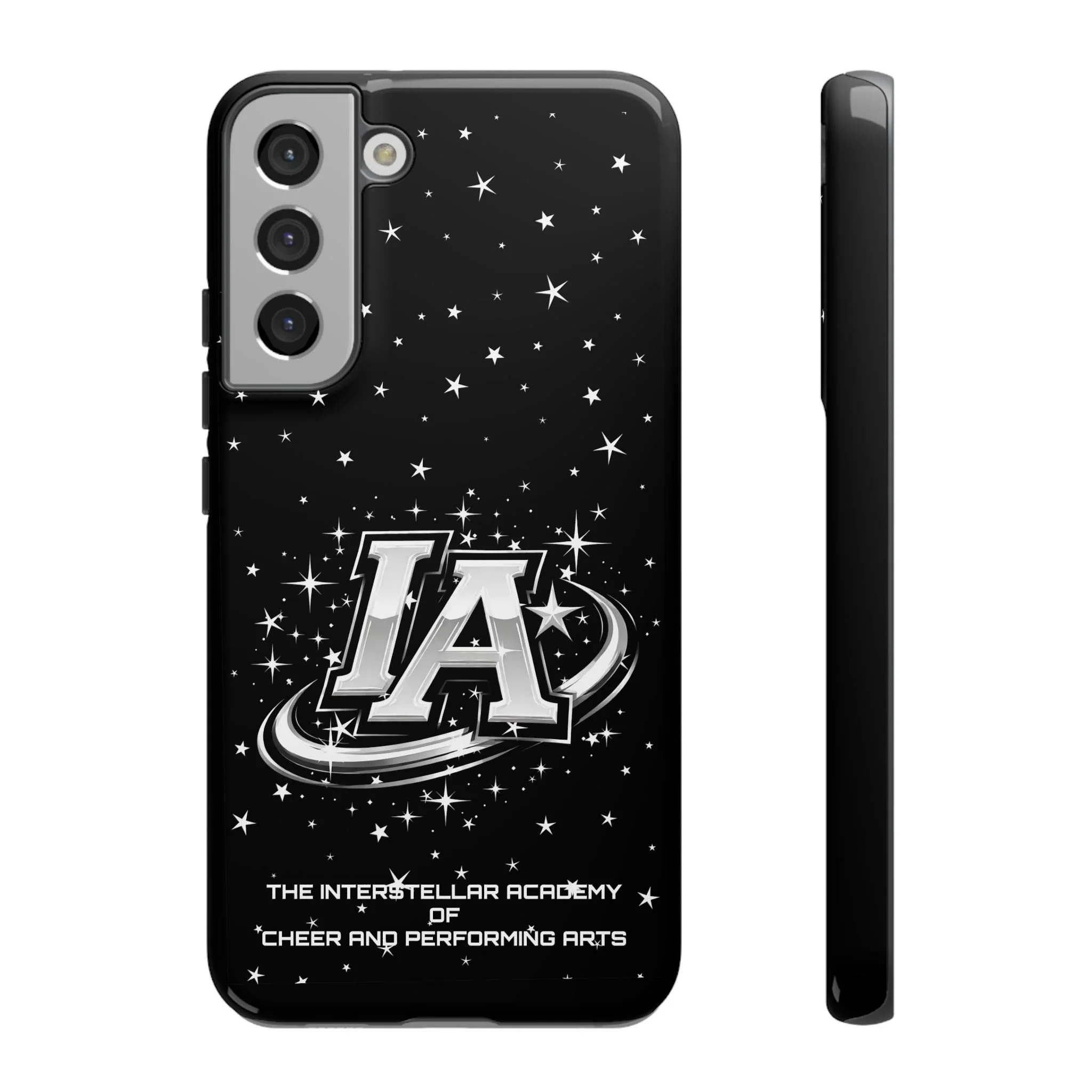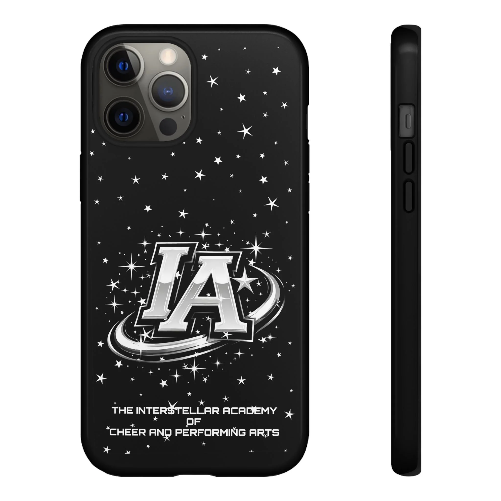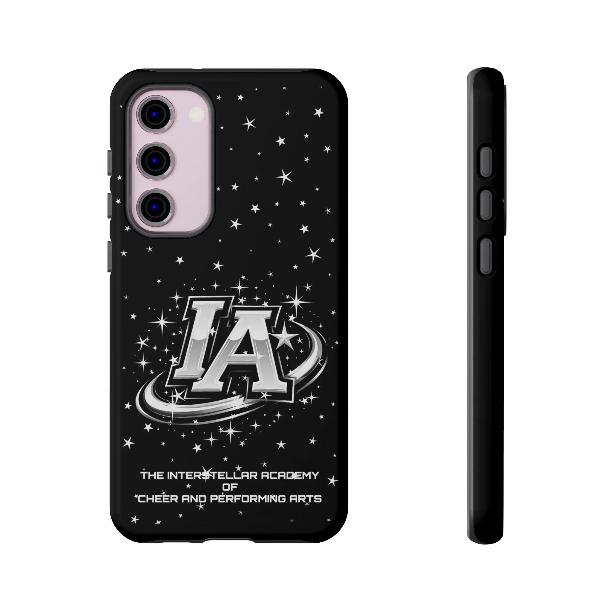 This protective phone case brings a bold, cosmic vibe to everyday carry. A glossy black background scatters tiny stars displaying the Interstellar Academy IA logo. The case feels sturdy in hand: a rigid polycarbonate shell with a soft TPU silicone liner absorbs shocks and cushions drops. UV protection keeps the print looking sharp outdoors; clear cutouts preserve easy access to ports and wireless charging. It’s the kind of case that reads like team gear for performers who want stage-ready sparkle in their pocket.
