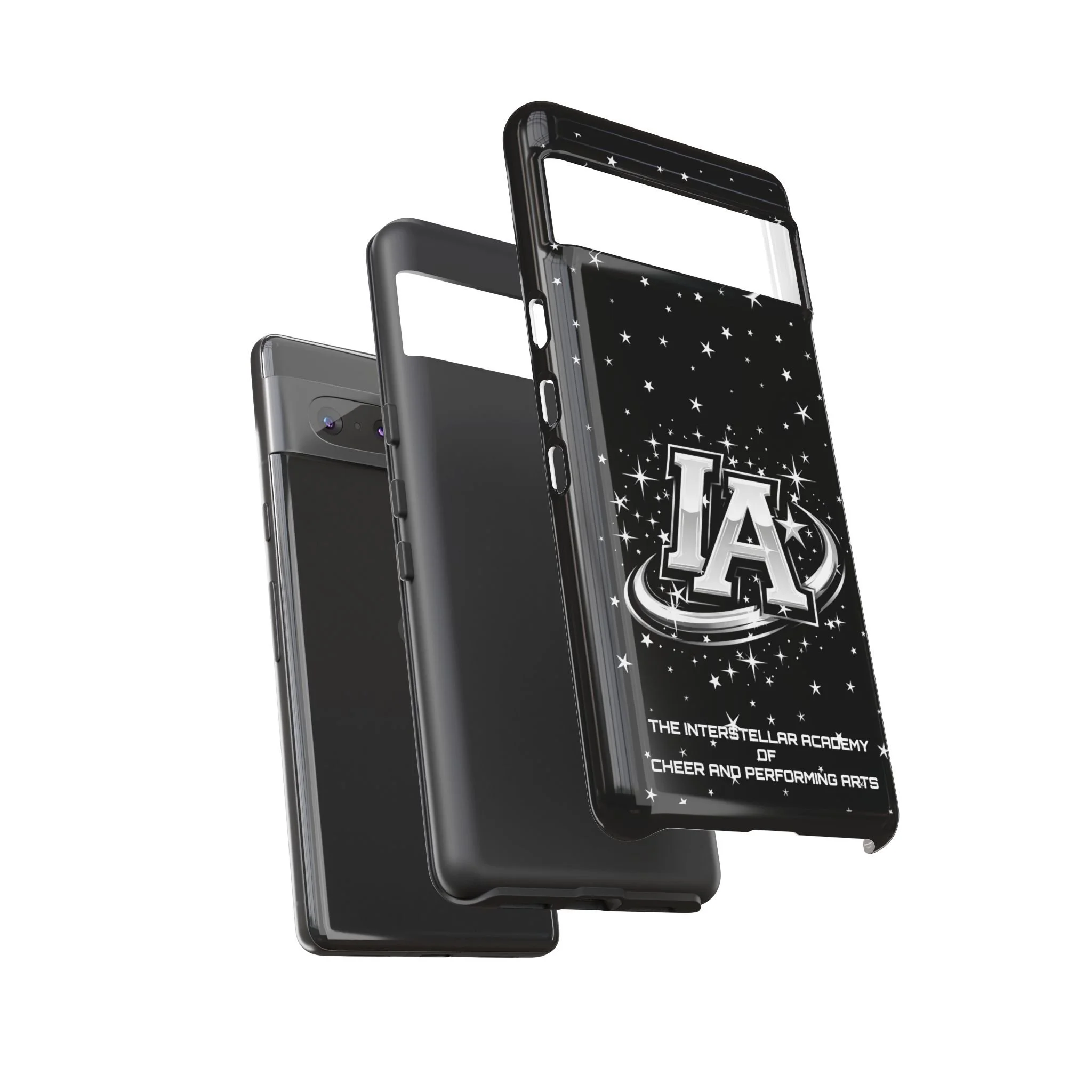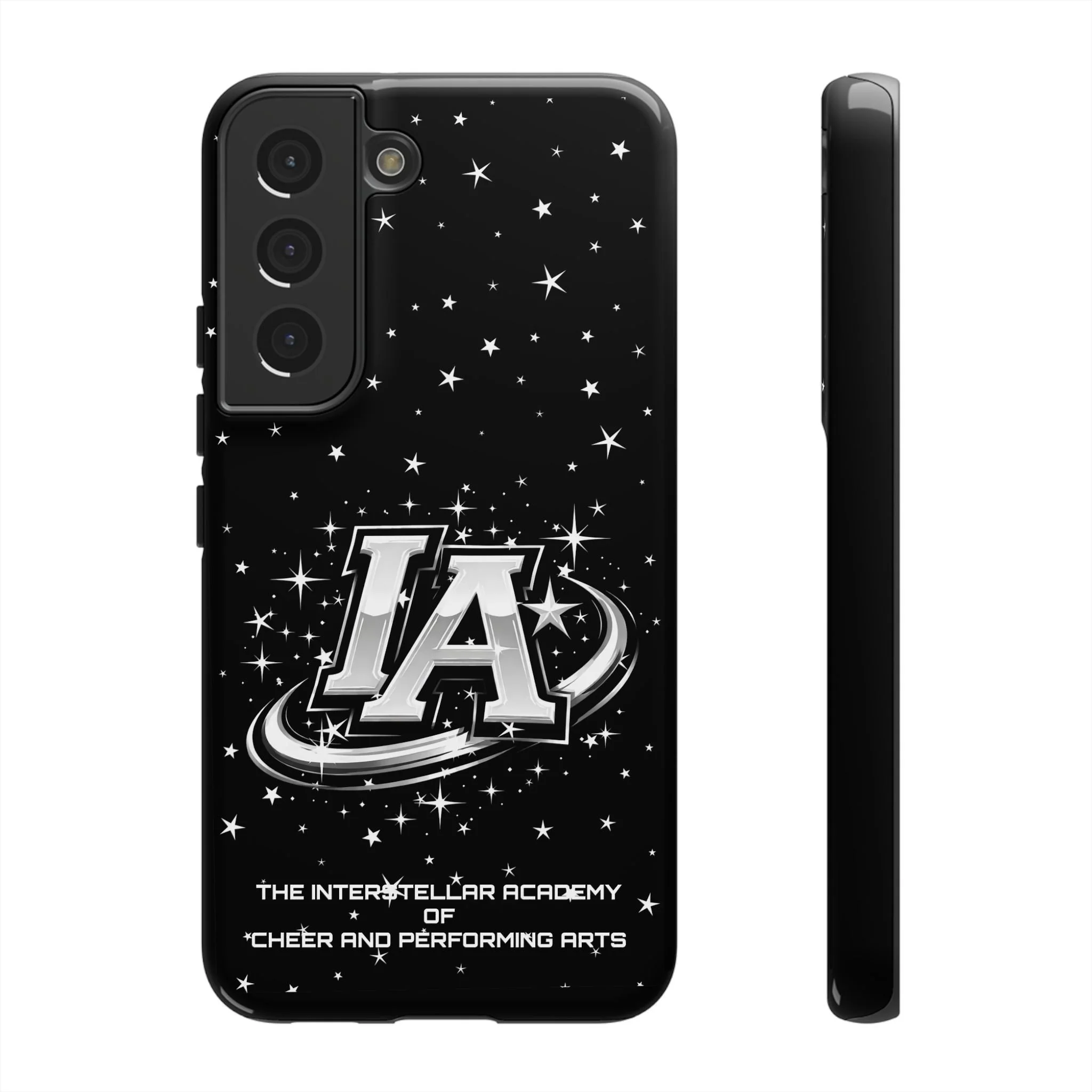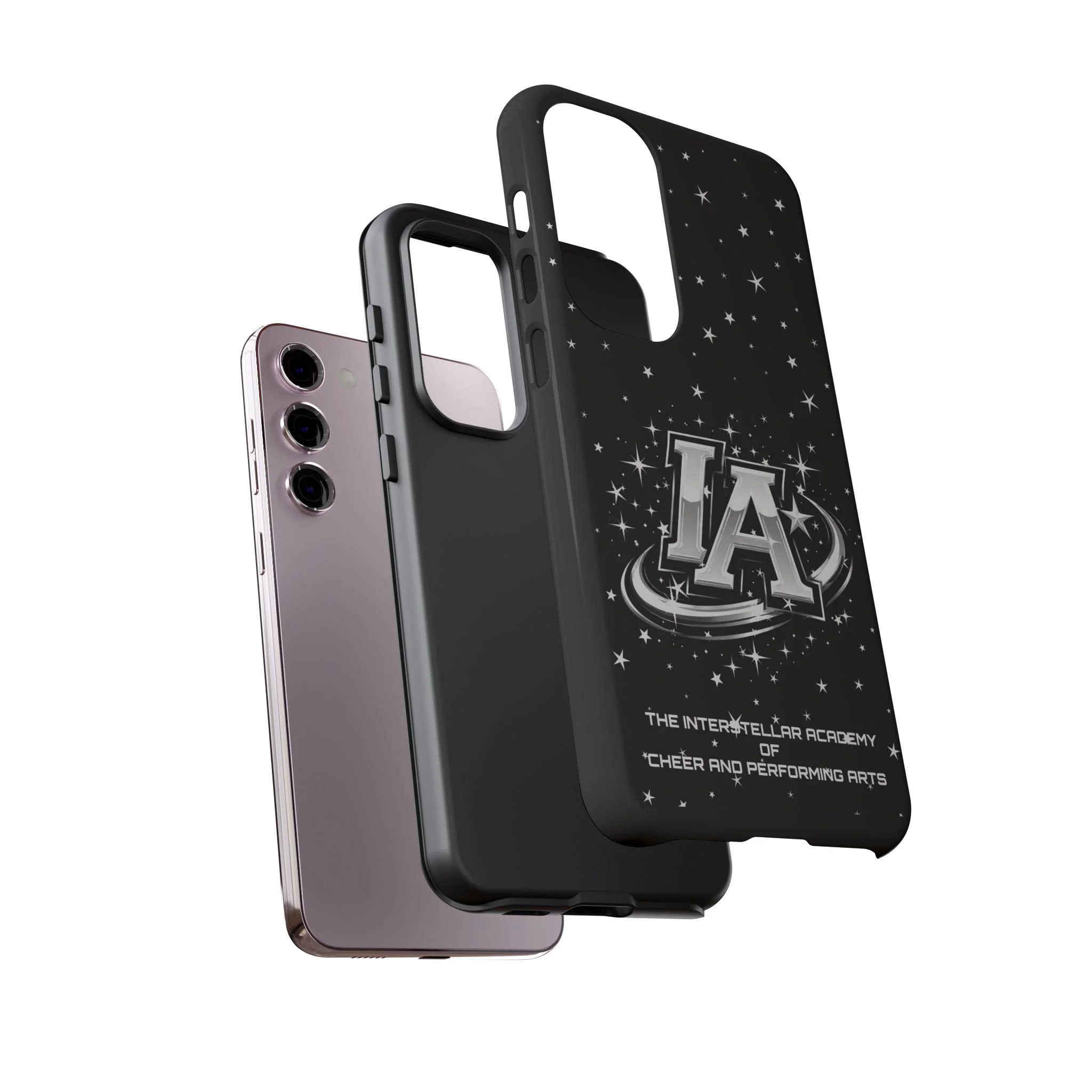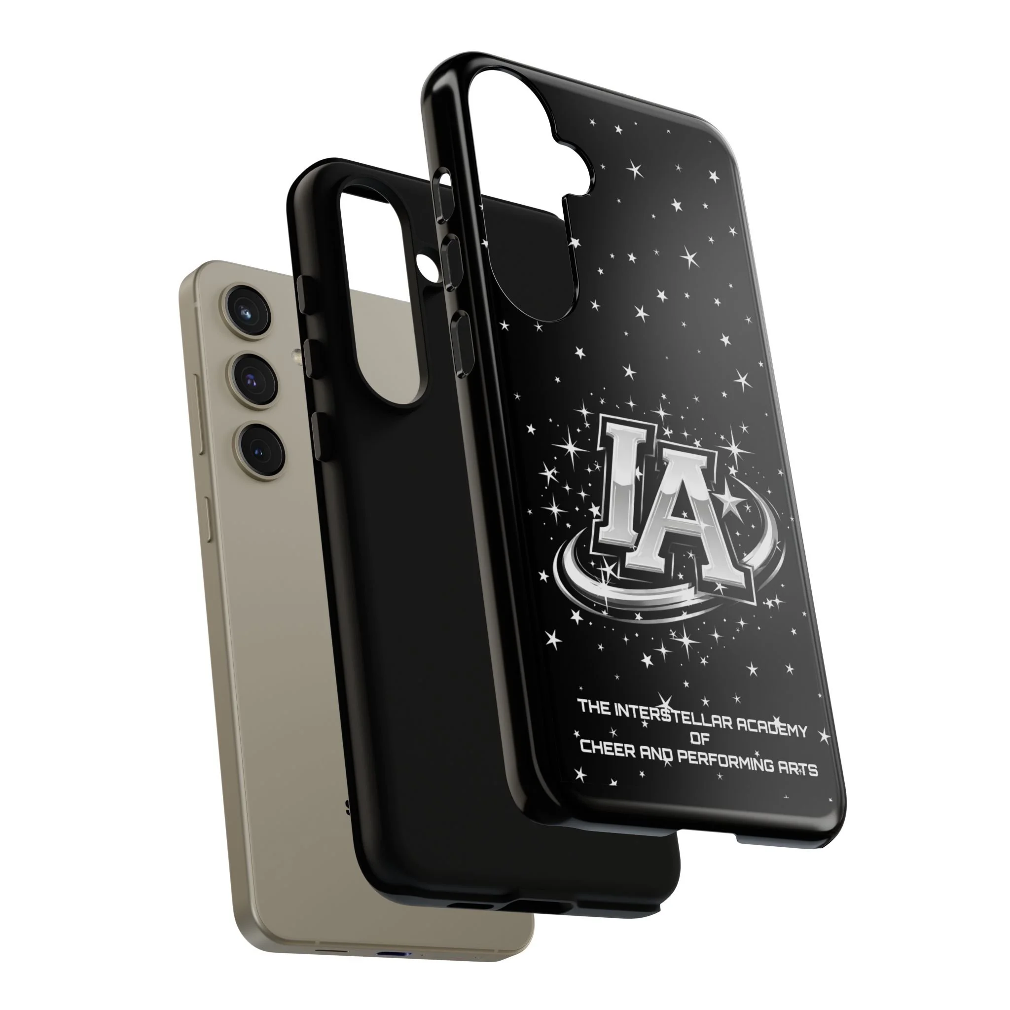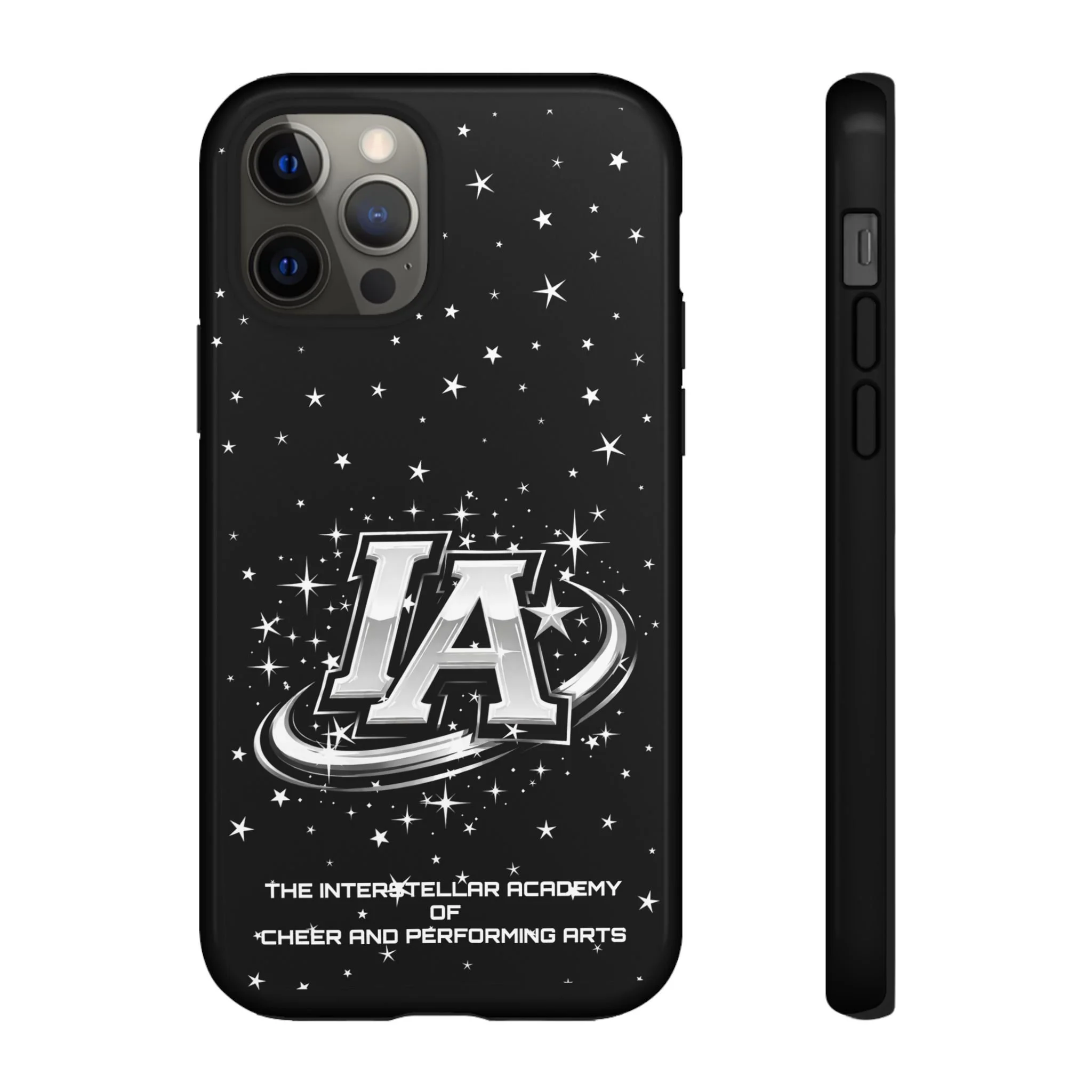 This protective phone case brings a bold, cosmic vibe to everyday carry. A glossy black background scatters tiny stars displaying the Interstellar Academy IA logo. The case feels sturdy in hand: a rigid polycarbonate shell with a soft TPU silicone liner absorbs shocks and cushions drops. UV protection keeps the print looking sharp outdoors; clear cutouts preserve easy access to ports and wireless charging. It’s the kind of case that reads like team gear for performers who want stage-ready sparkle in their pocket.