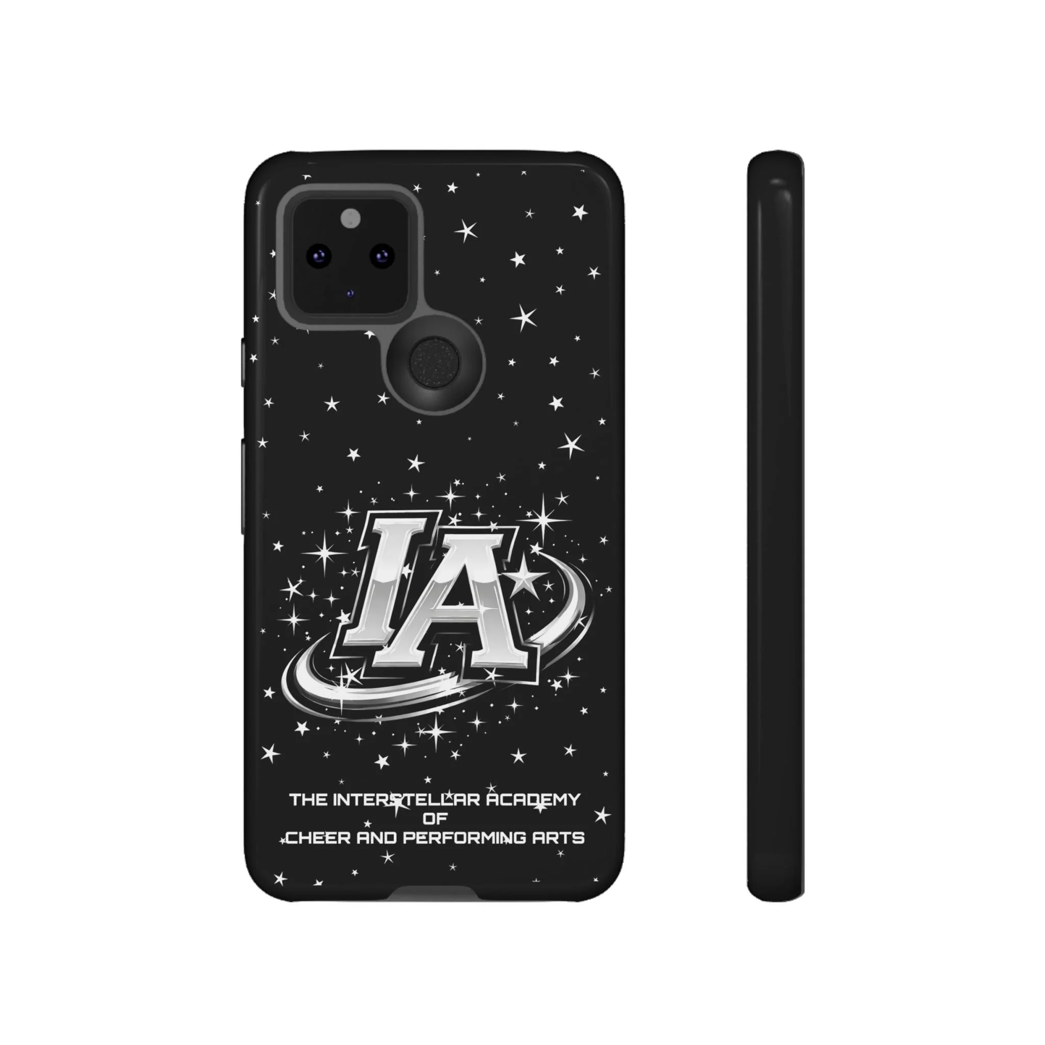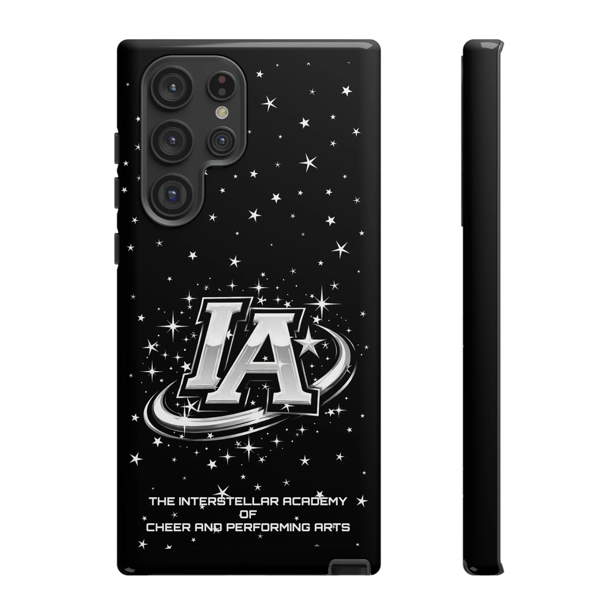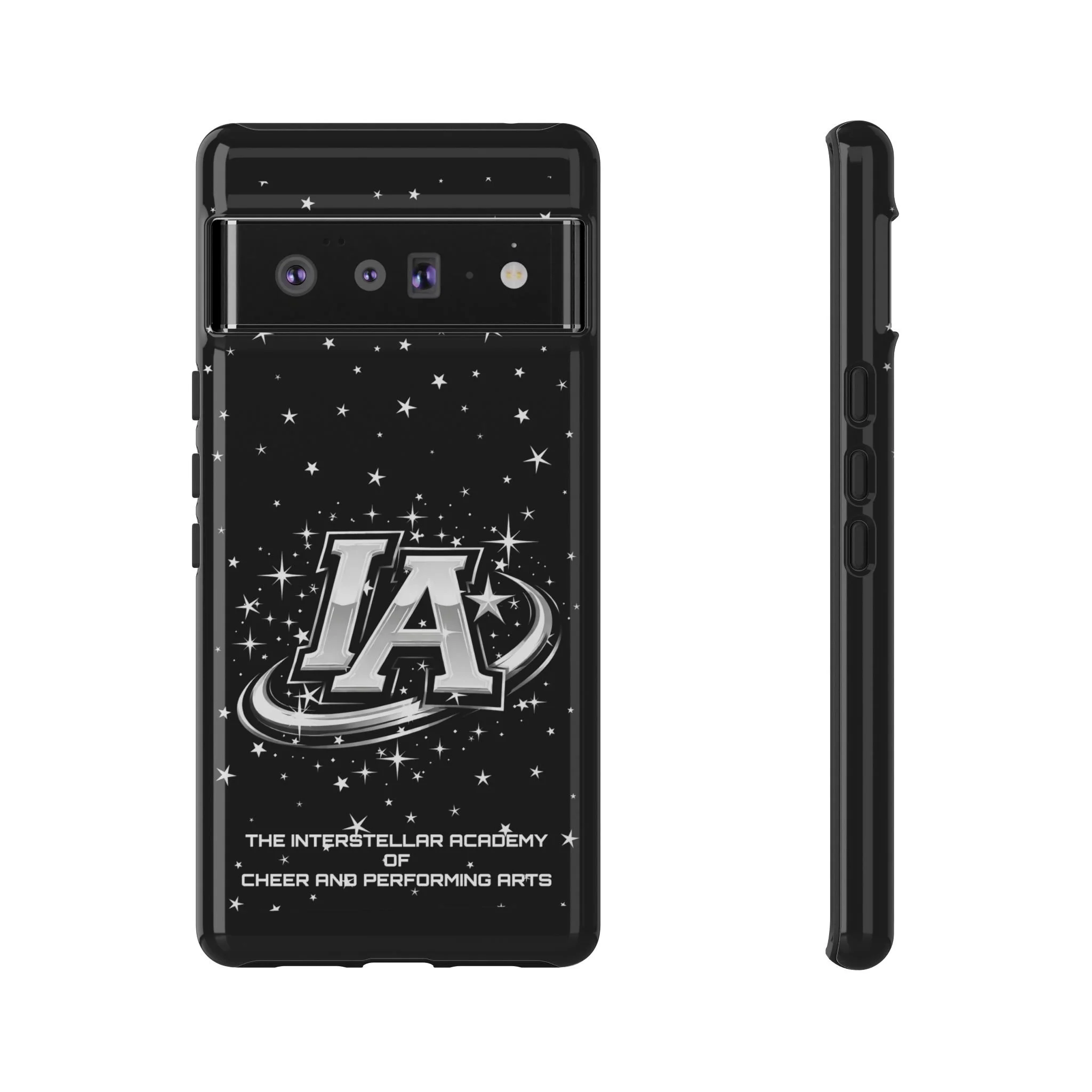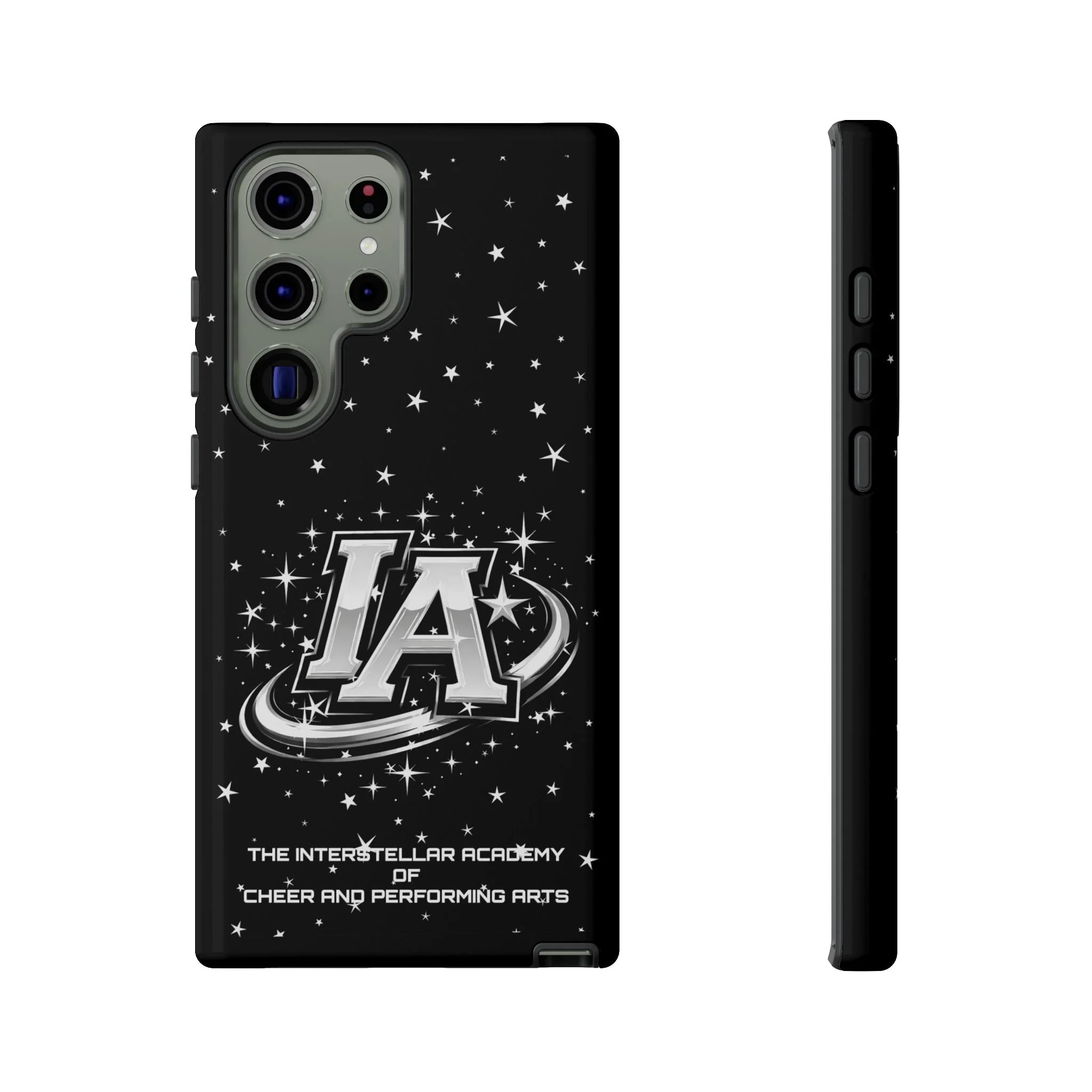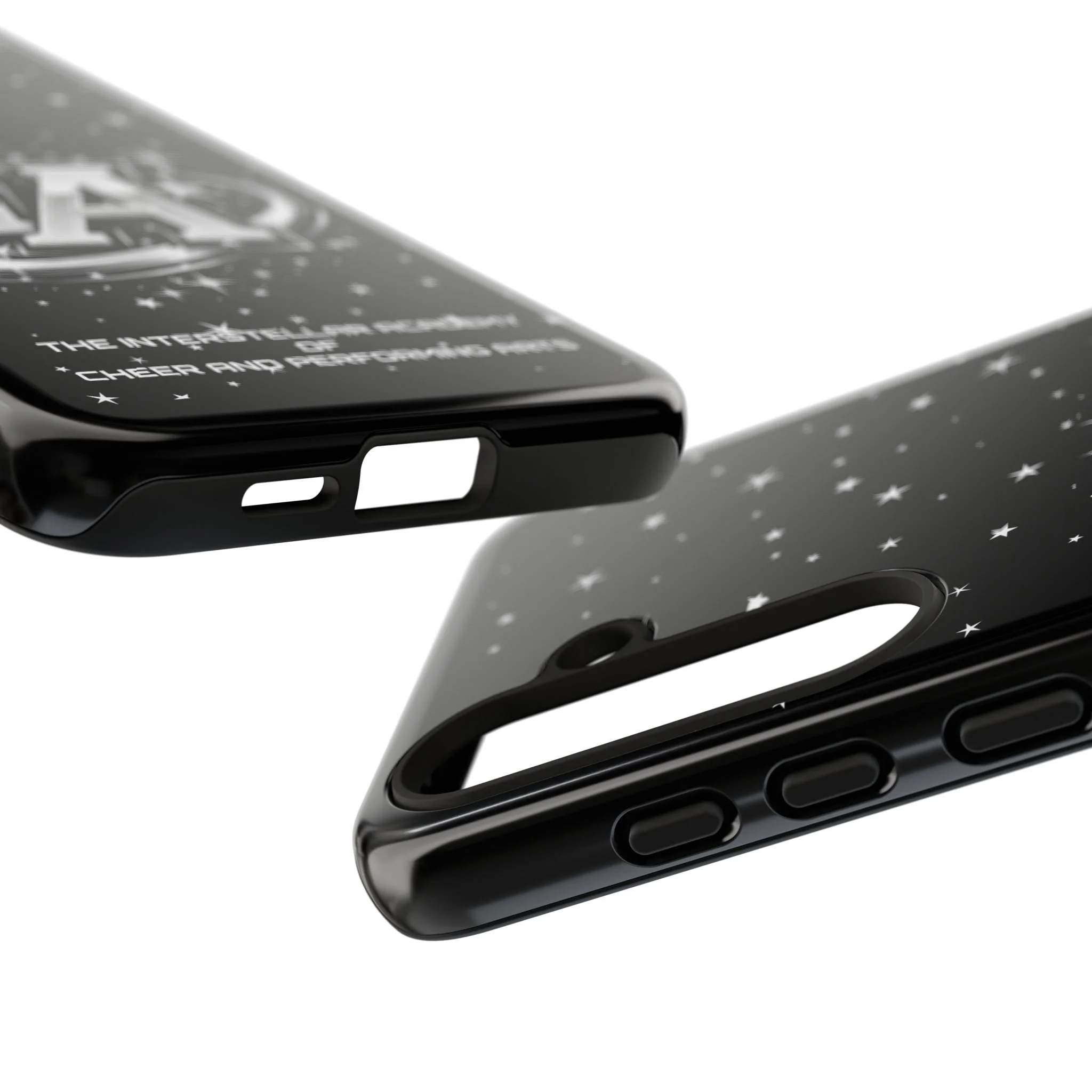 This protective phone case brings a bold, cosmic vibe to everyday carry. A glossy black background scatters tiny stars displaying the Interstellar Academy IA logo. The case feels sturdy in hand: a rigid polycarbonate shell with a soft TPU silicone liner absorbs shocks and cushions drops. UV protection keeps the print looking sharp outdoors; clear cutouts preserve easy access to ports and wireless charging. It’s the kind of case that reads like team gear for performers who want stage-ready sparkle in their pocket.
