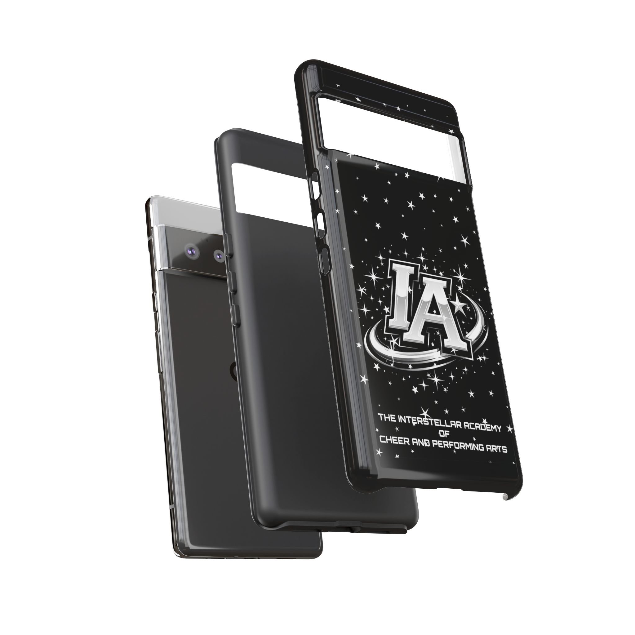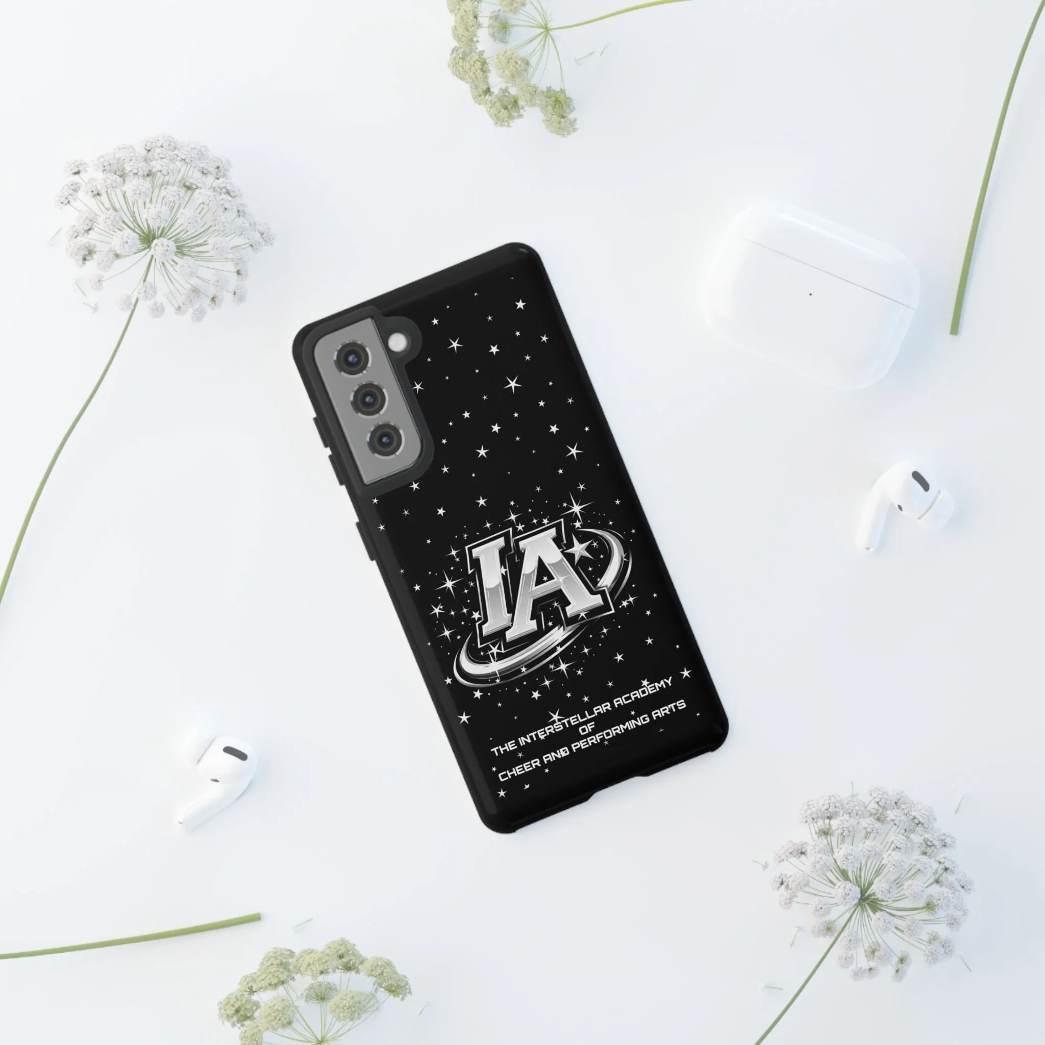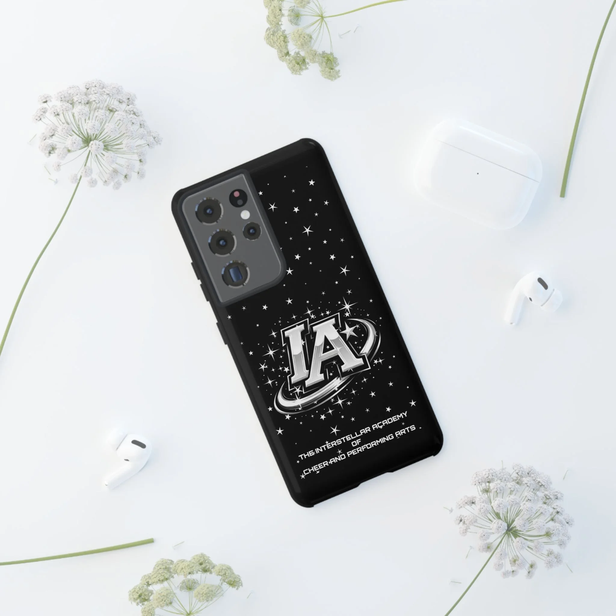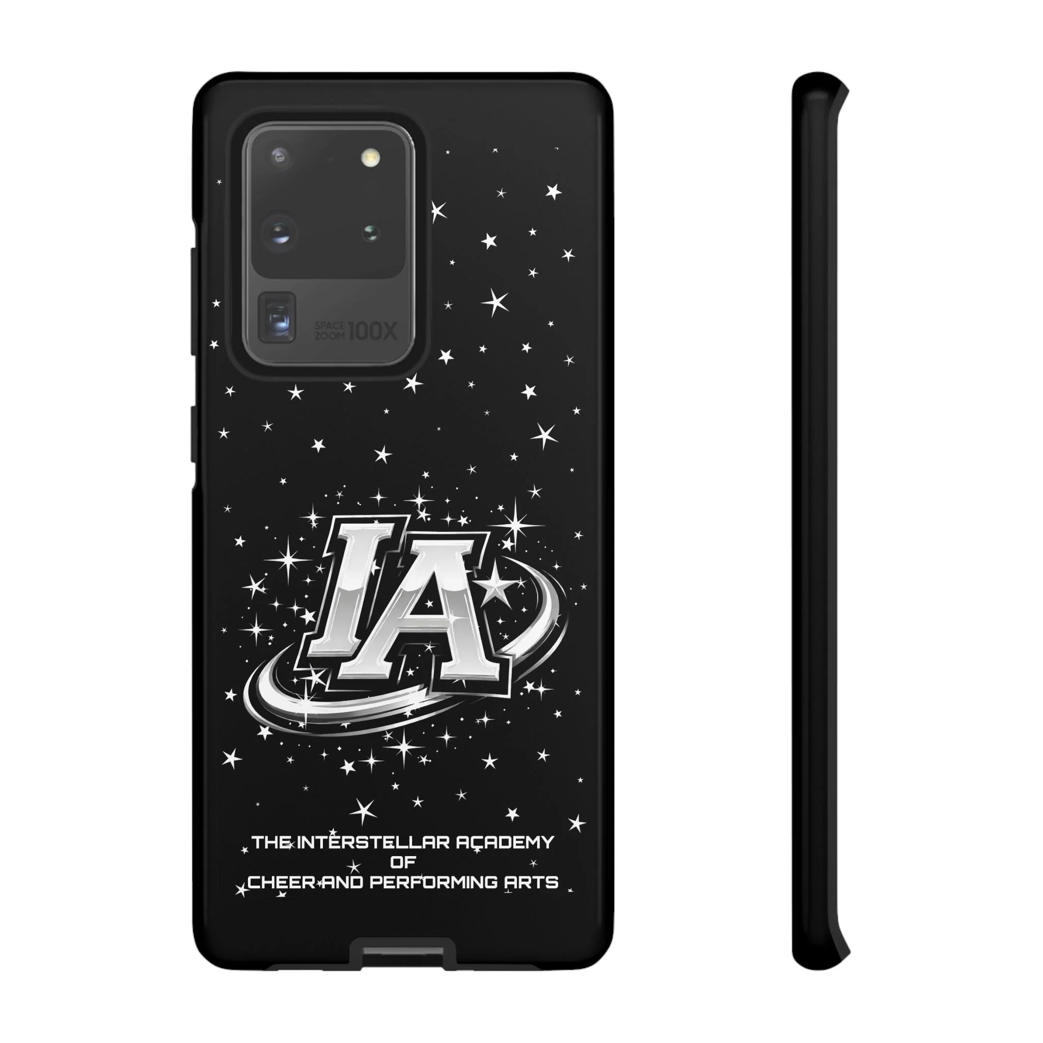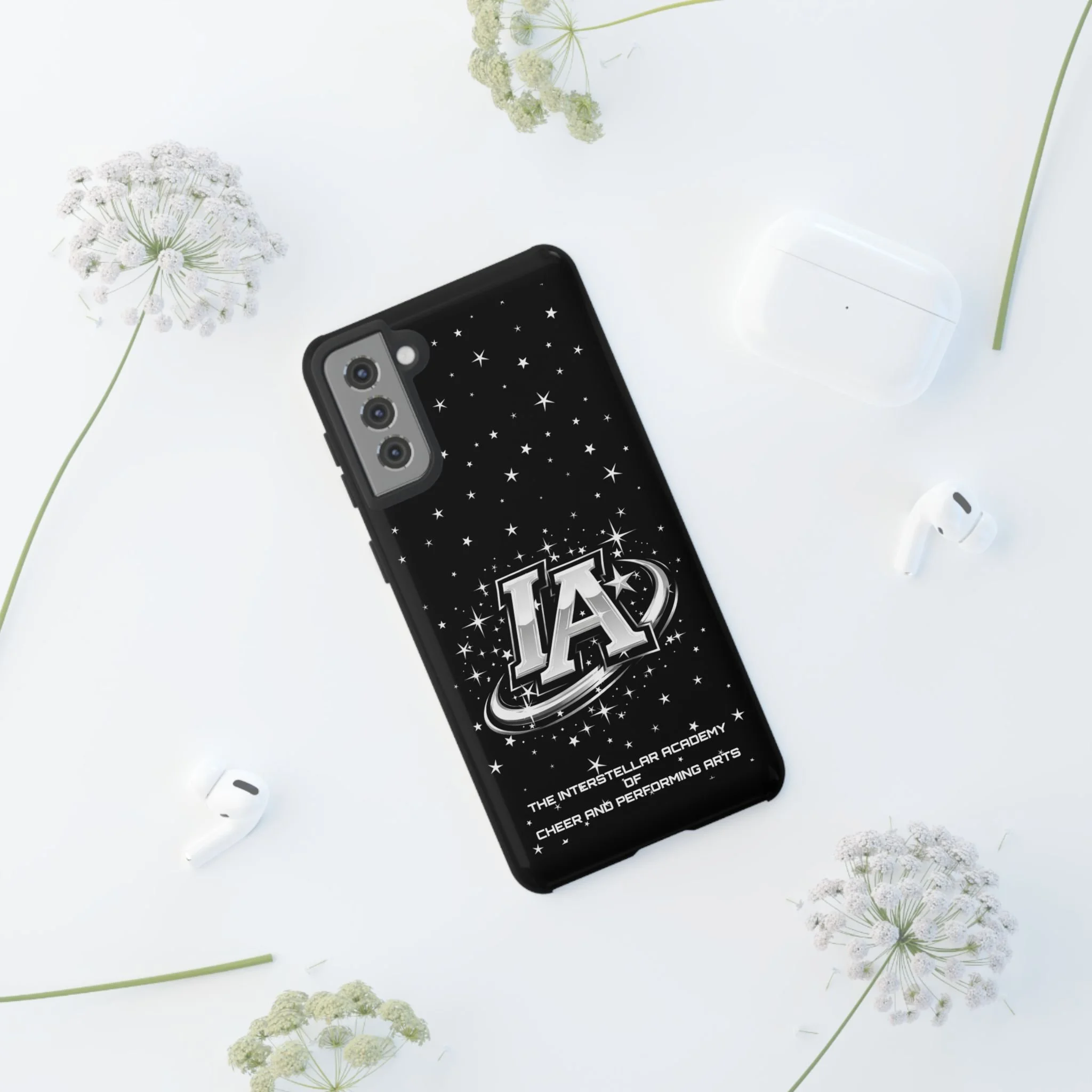 This protective phone case brings a bold, cosmic vibe to everyday carry. A glossy black background scatters tiny stars displaying the Interstellar Academy IA logo. The case feels sturdy in hand: a rigid polycarbonate shell with a soft TPU silicone liner absorbs shocks and cushions drops. UV protection keeps the print looking sharp outdoors; clear cutouts preserve easy access to ports and wireless charging. It’s the kind of case that reads like team gear for performers who want stage-ready sparkle in their pocket.