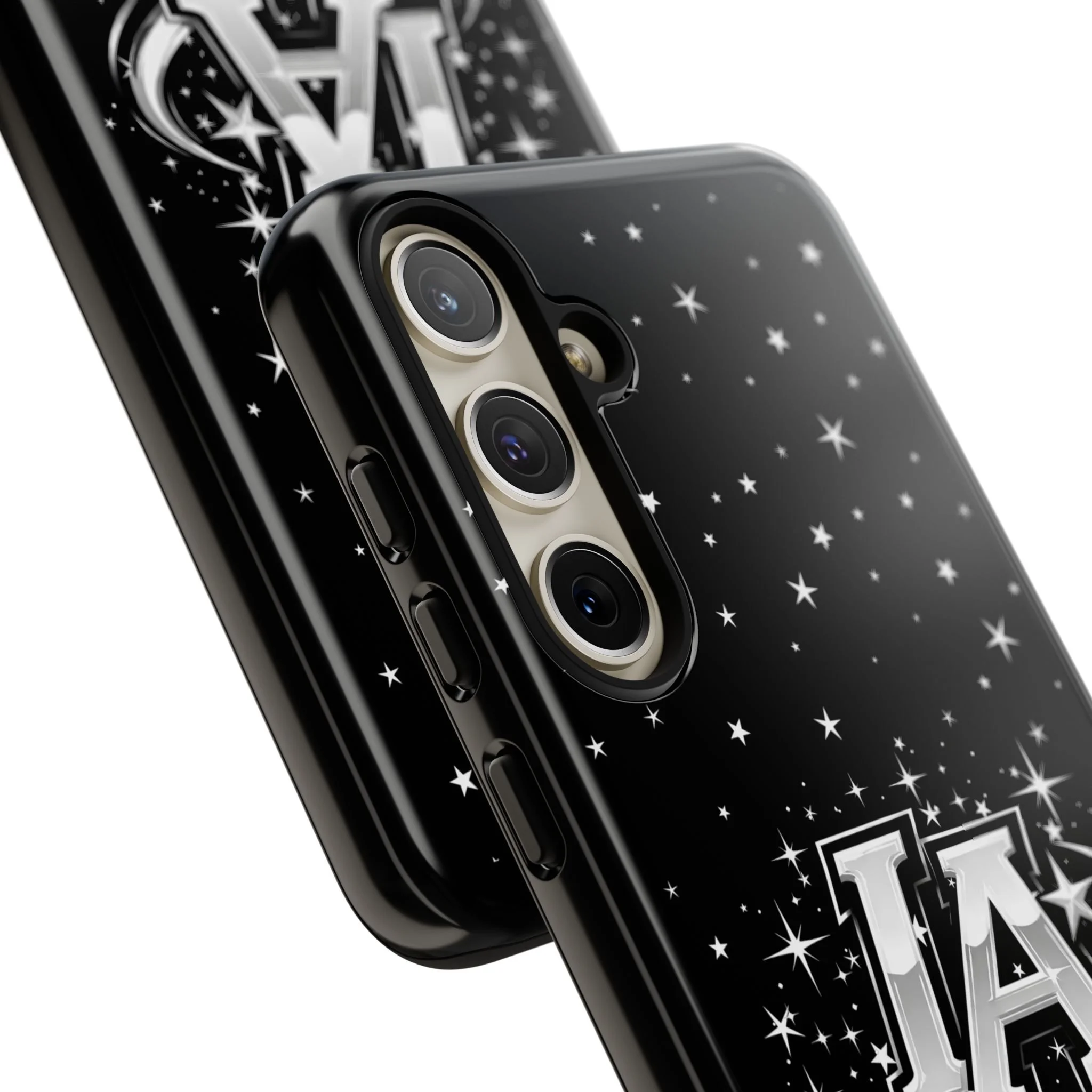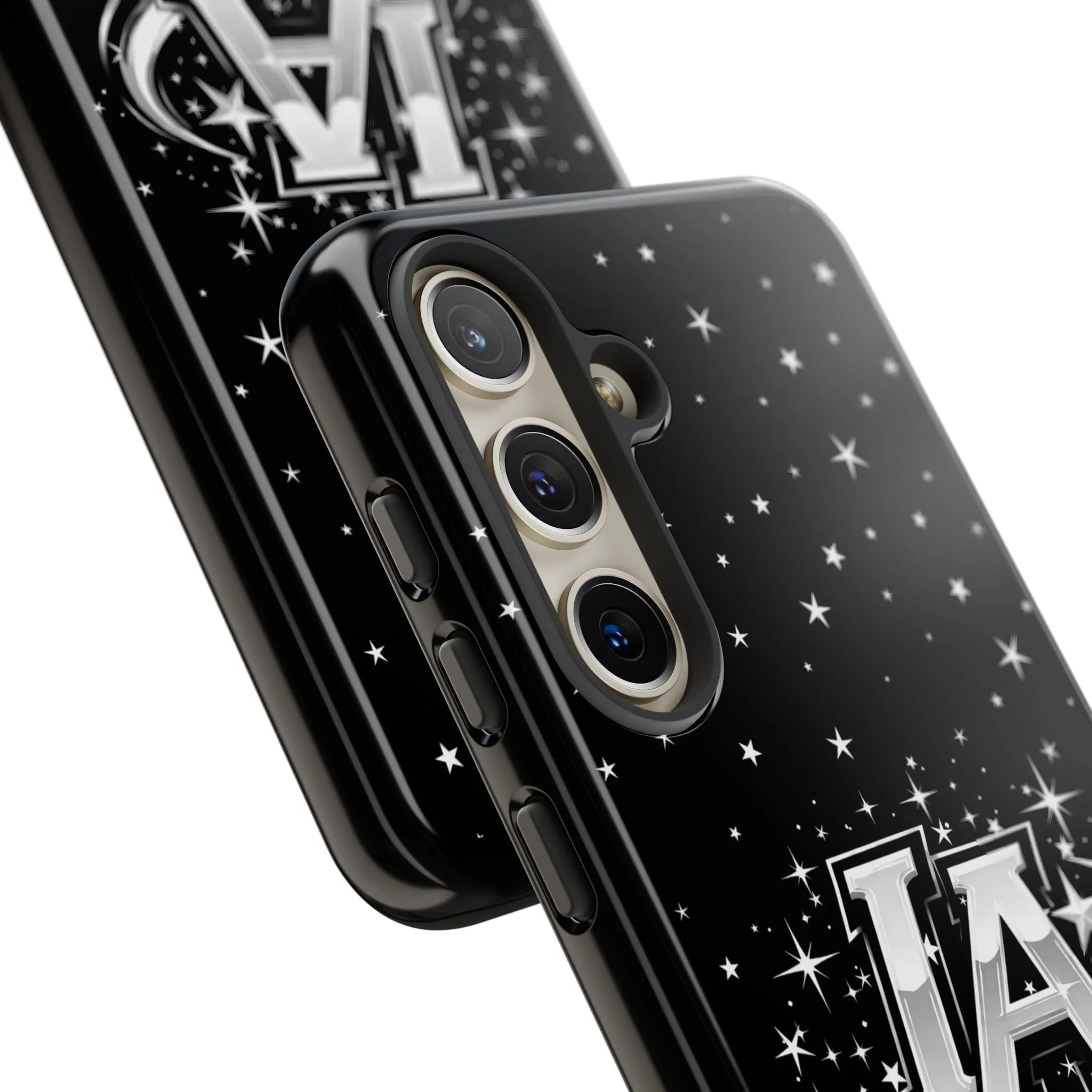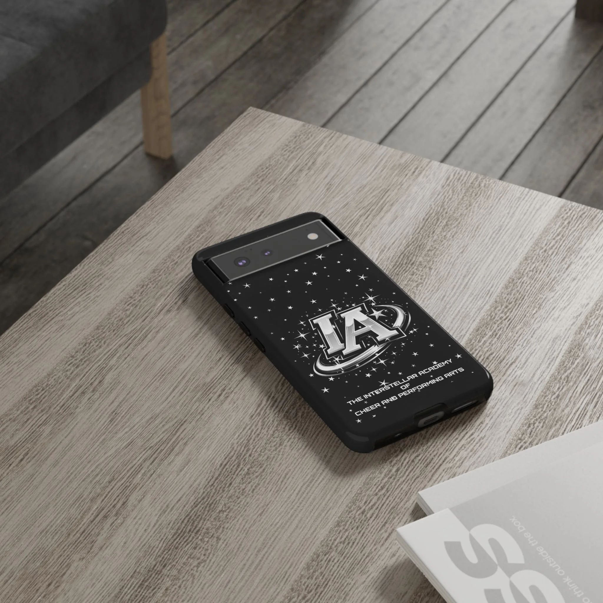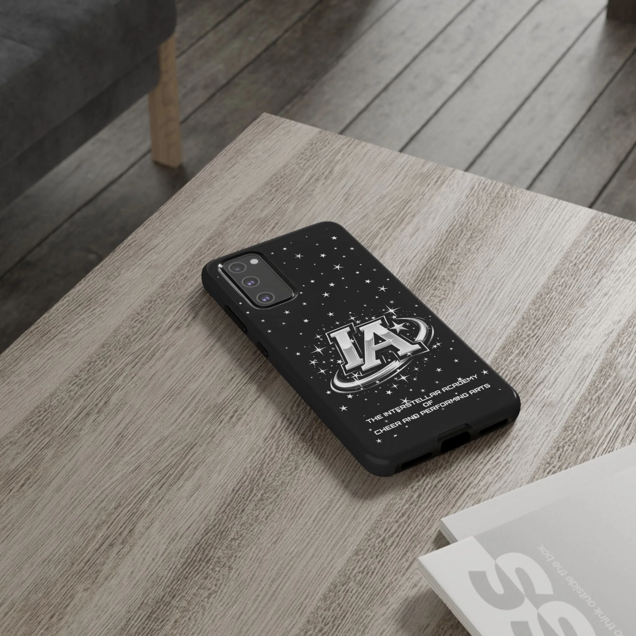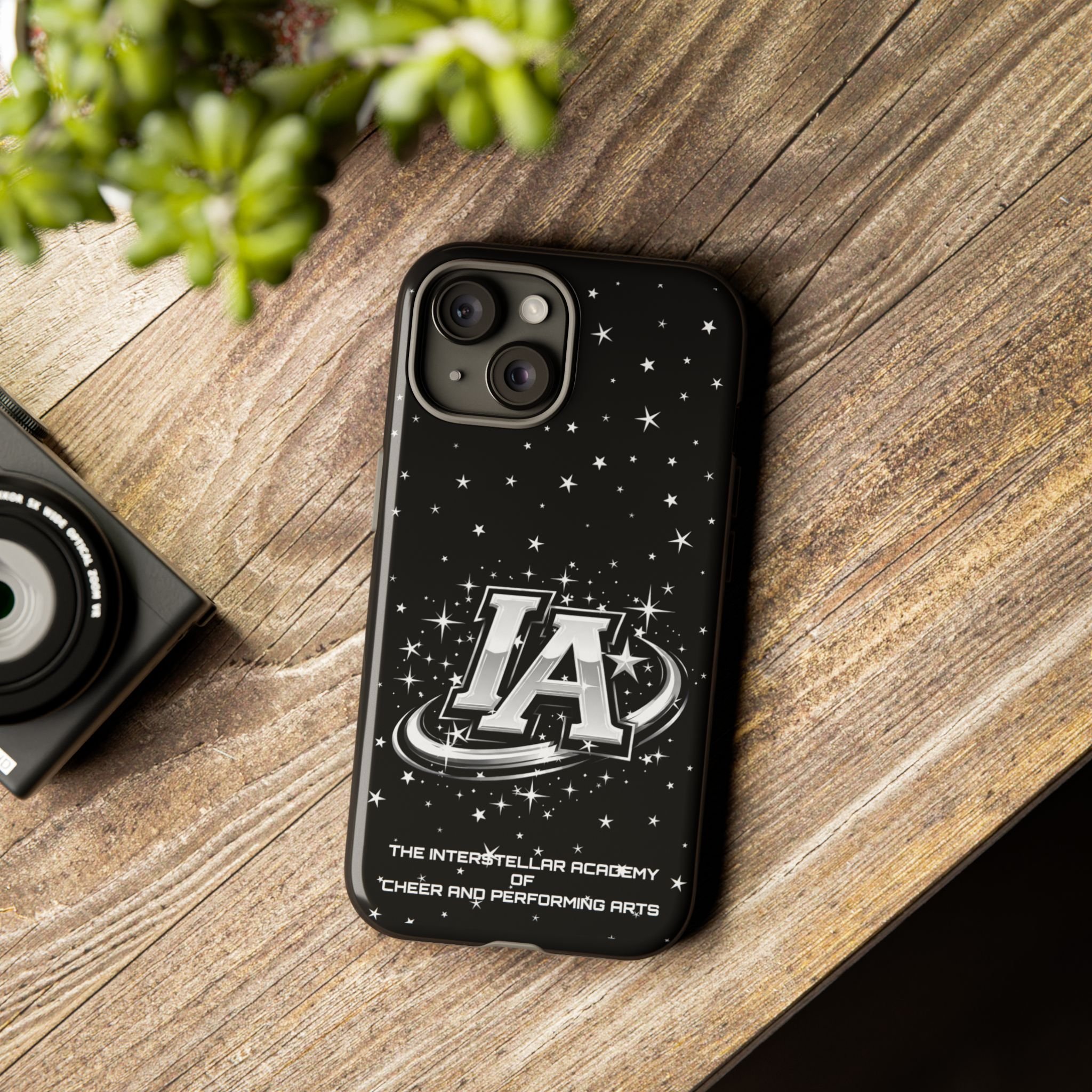 This protective phone case brings a bold, cosmic vibe to everyday carry. A glossy black background scatters tiny stars displaying the Interstellar Academy IA logo. The case feels sturdy in hand: a rigid polycarbonate shell with a soft TPU silicone liner absorbs shocks and cushions drops. UV protection keeps the print looking sharp outdoors; clear cutouts preserve easy access to ports and wireless charging. It’s the kind of case that reads like team gear for performers who want stage-ready sparkle in their pocket.